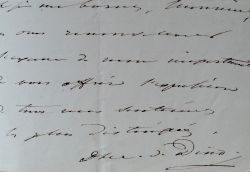 Belle lettre de la duchesse de Dino : « Je n'ai aucun titre à faire valoir auprès de vous monsieur, il n'y a pas une raison au monde pour que vous ayez envie de faire une chose parce qu'elle m'est agréable aussi ne puis-je presque pas douter de l'inutilité de mes démarches ; peut-être même de son inconvenance mais il est des devoirs dont on veut s'acquitter quand même J'en ai vis-à-vis de M. (Casaneles ?) qui est mon filleul, qui est né dans la maison de mes parents, que j'ai contribué à élever, à marier ; qui n'a guère de soutien actif que moi ; qui a du mérite, du savoir, de l'activité, une juste ambition et qui ne ferait pas honte à la protection que vous voudriez bien lui accorder auprès de M. Barthes [Félix Barthes (1795/1863), ministre de l'Instruction Publique]. [...] « Je reçois à l'instant, monsieur, la nouvelle de la mise en liberté de M. D la Flavie (?) : je n'ose pas me flatter que j'aie été pour quelques chose dans cet acte de dénouement ; mais j'ai éprouvé une joie dont j'ai besoin de vous parler, à vous, Monsieur, tout particulièrement. »