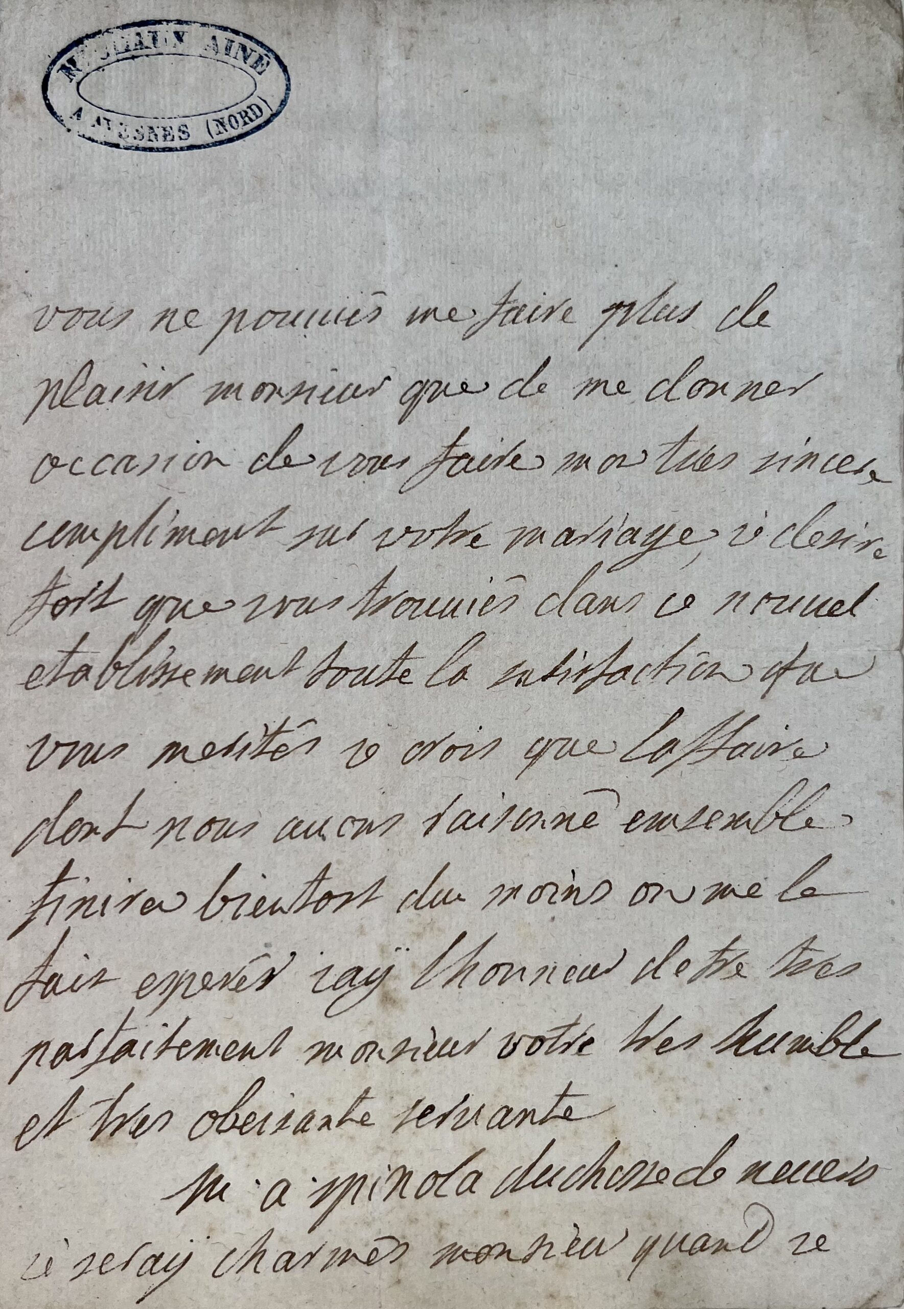La duchesse de Nevers félicite le comte de Gommegnies pour son récent mariage