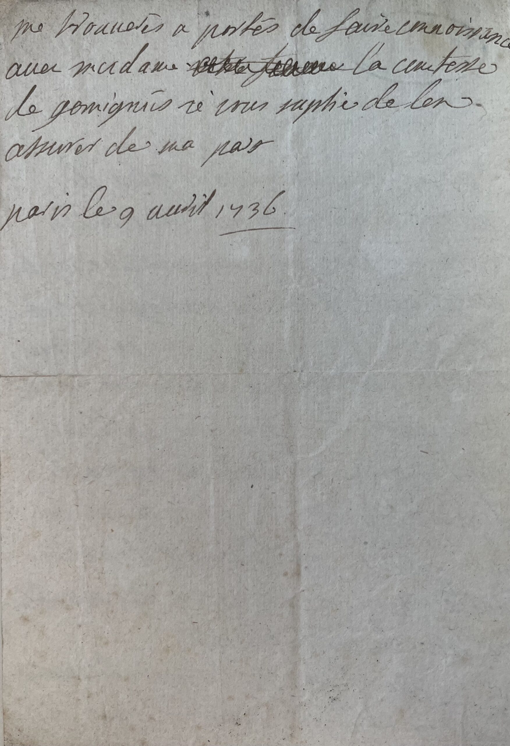 La duchesse de Nevers, Marie-Anne Spinola, félicite le comte de Gomignies [Gommegnies] pour son mariage : "je désire fort que vous trouvies dans ce nouvel établissement toute la satisfaction que vous merites [...]". Elle voudrait rencontrer sa femme et ajoute qu'une affaire qui les concerne "finira bientôt".