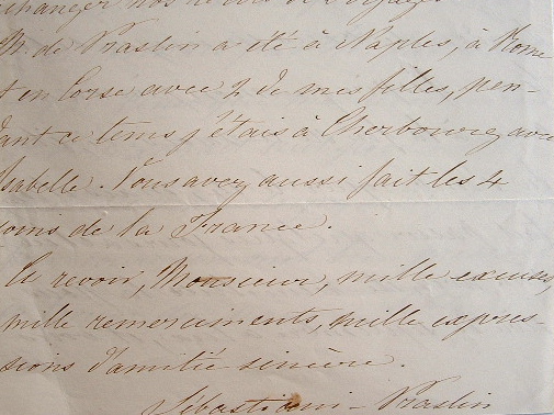 Françoise (dite Fanny) Praslin (Sébastiani della Porta, duchesse de) (Constantinople, 1807/1847)La duchesse de Praslin qui, trois ans plus tard, sera assassinée par son mari, adresse une chaude recommandation pour son ami Leblanc, qu'elle connaît depuis 20 ans, qui fut au service du maréchal Sabastiani, avant de passer à celui des Praslin. Elle donne aussi des nouvelles du maréchal et de son mari. «M. de Praslin a été à Naples, à Rome et en Corse avec 2 de mes filles ; pendant ce temps, j'étais à Cherbourg avec Isabelle. Vous avez aussi fait les 4 coins de la France [...]». [Maxime du Camp l'a décrite comme une femme "sans habileté, poursuivant son mari de ses désirs, lui écrivant vingt lettres par jour, le harassant de reproches et de souvenirs, violente et jalouse ; elle représente un type assez rare, celui de la nymphomane vertueuse". Le duc, excédé du comportement de sa femme, l'assassina à coups de couteau le 17 août 1847, dans l'appartement qu'elle occupait dans l'hôtel Sébastiani, avant de se donner la mort, dans sa prison, le 24 août, en absorbant une forte quantité d'arsenic].