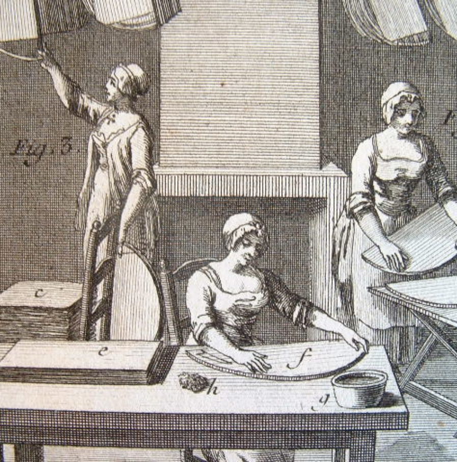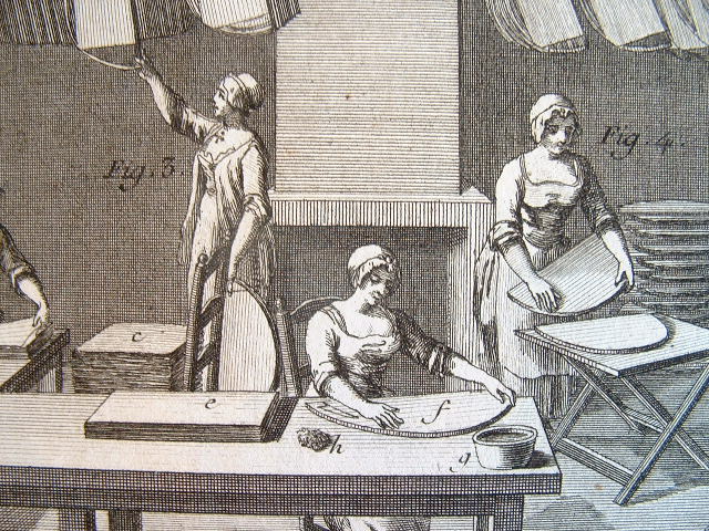 Série de 4 planches gravées extraites de l'Encyclopédie Diderot - d'Alembert (+ 2 pp. de légende), consacrée au travail de l'éventailliste (vue d'un atelier, monture, préparation des feuilles).