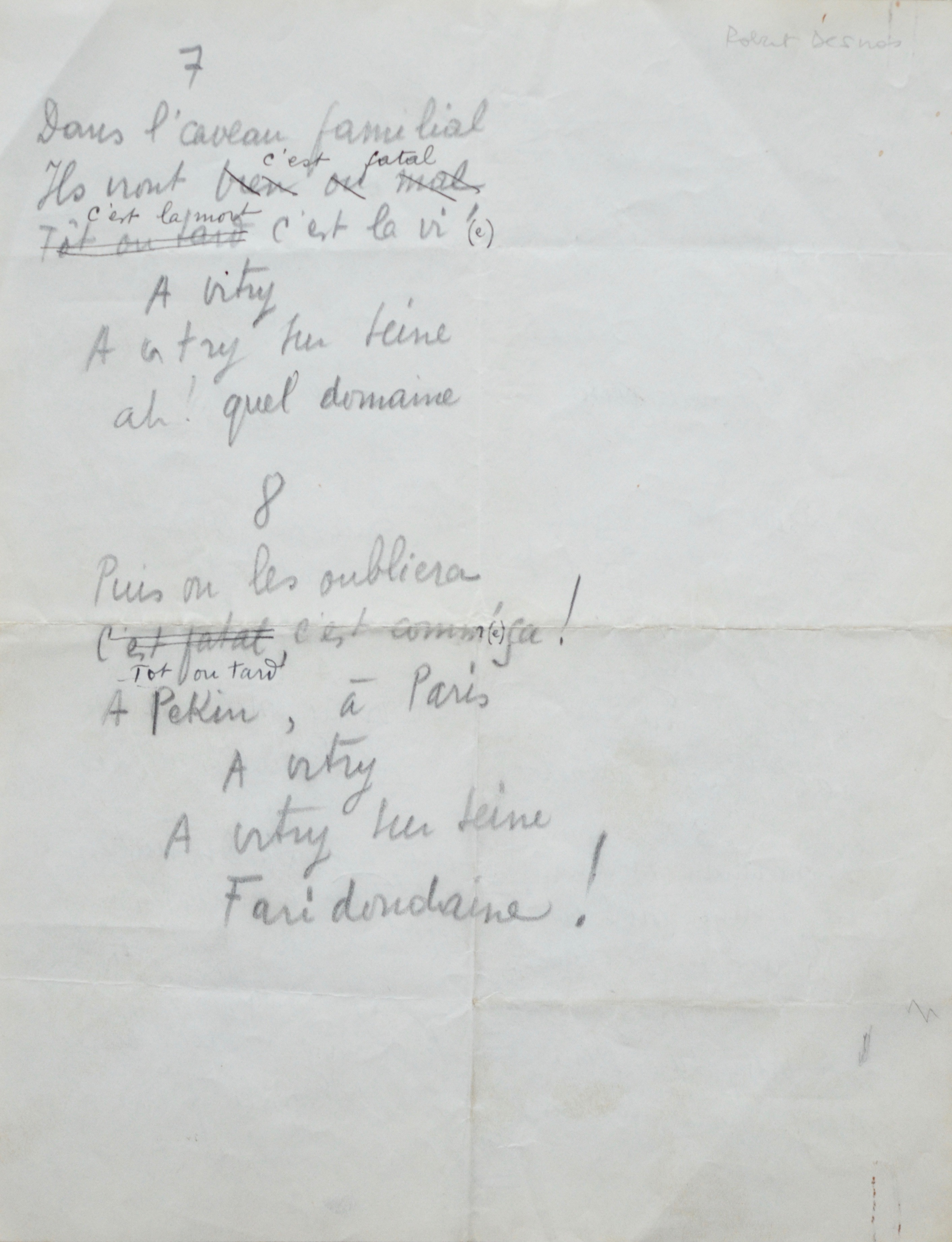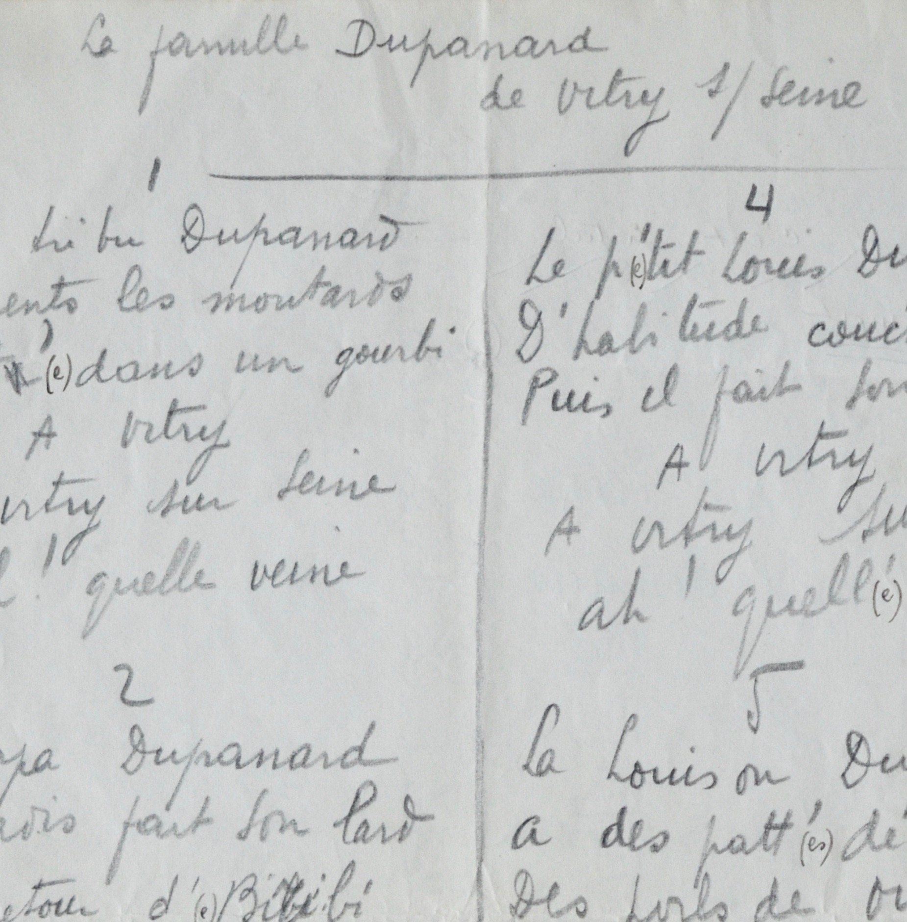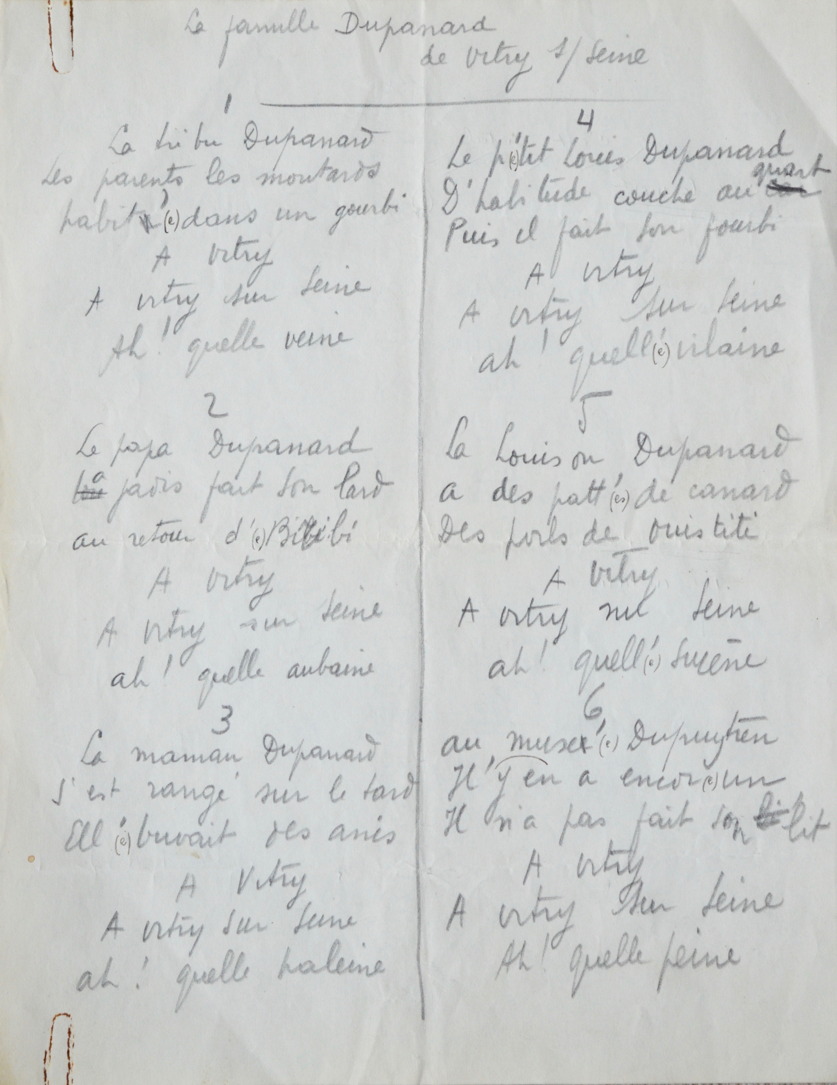 Robert Desnos (Paris, 1900/1945)Manuscrit autographe d'une chanson populaire de Robert Desnos, intitulé «La Famille Dupanard de Vitry-sur Seine». Elle se compose de huit couplets. Ratures et corrections autographes à l'encre noire formant des variants à la version finale.