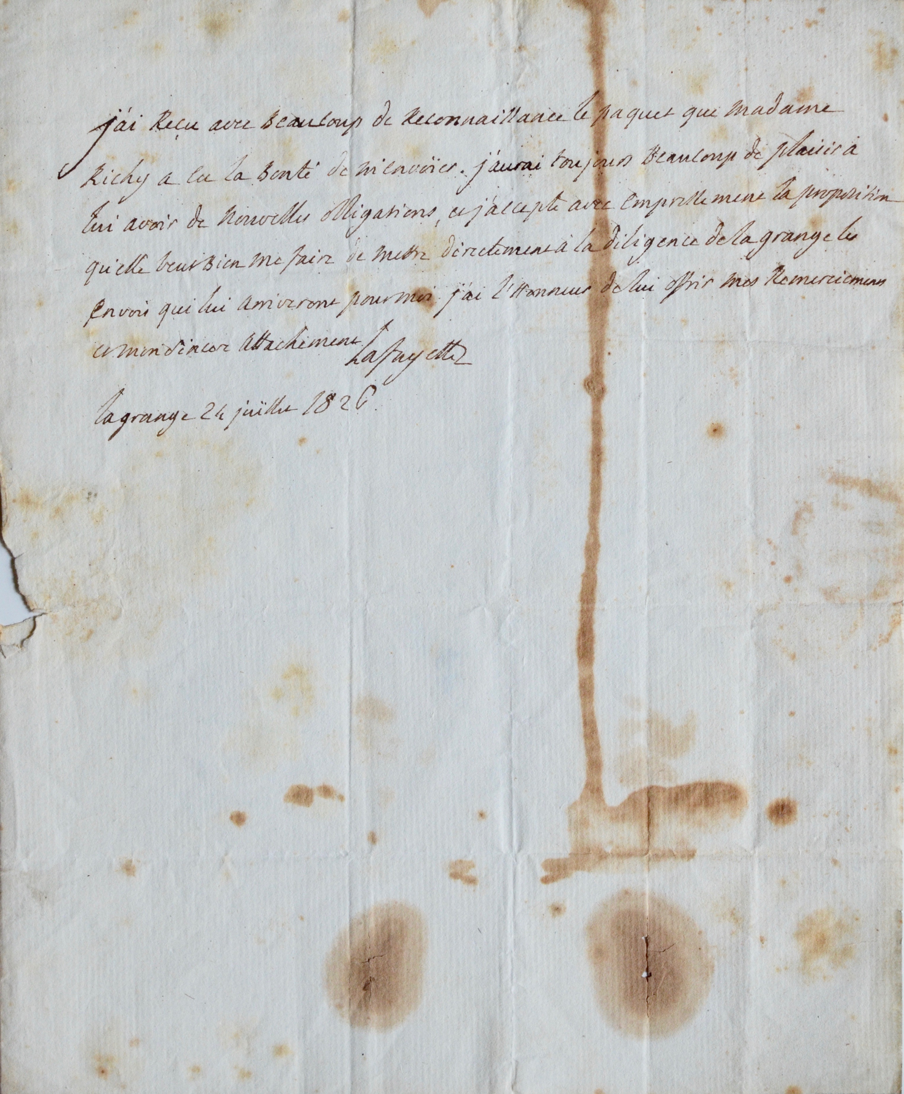 "J’ai reçu avec beaucoup de reconnaissance le paquet que madame Richy a eu la bonté de m’envoier. J’aurai toujours beaucoup de plaisir à lui avoir de nouvelles obligations, et j’accepte avec empressement la proposition qu’elle veut bien me faire de mettre directement la diligence de Lagrange les envois qui lui arriveront pour moi. J'ai l'honneur de lui offrir mes remerciements et mon sincère attachement [...]".