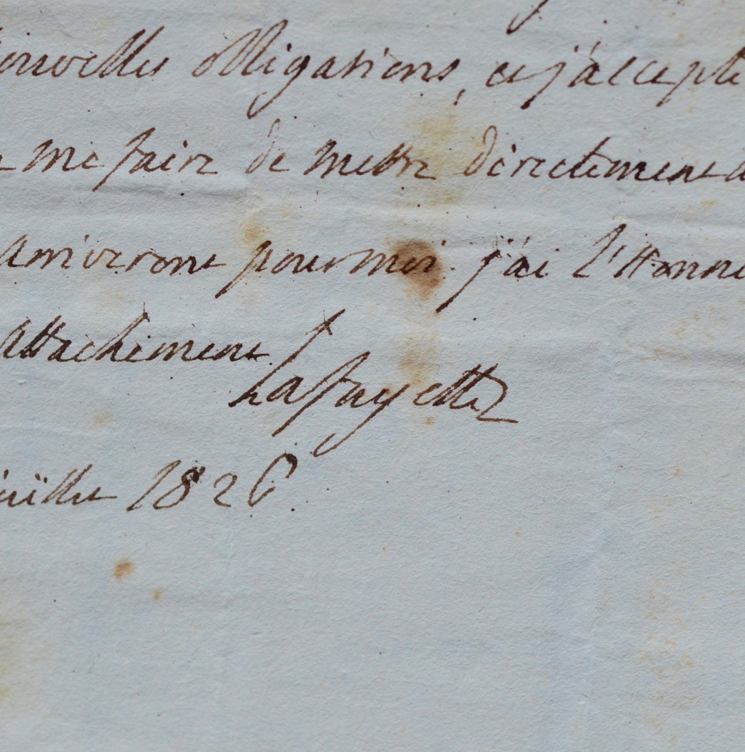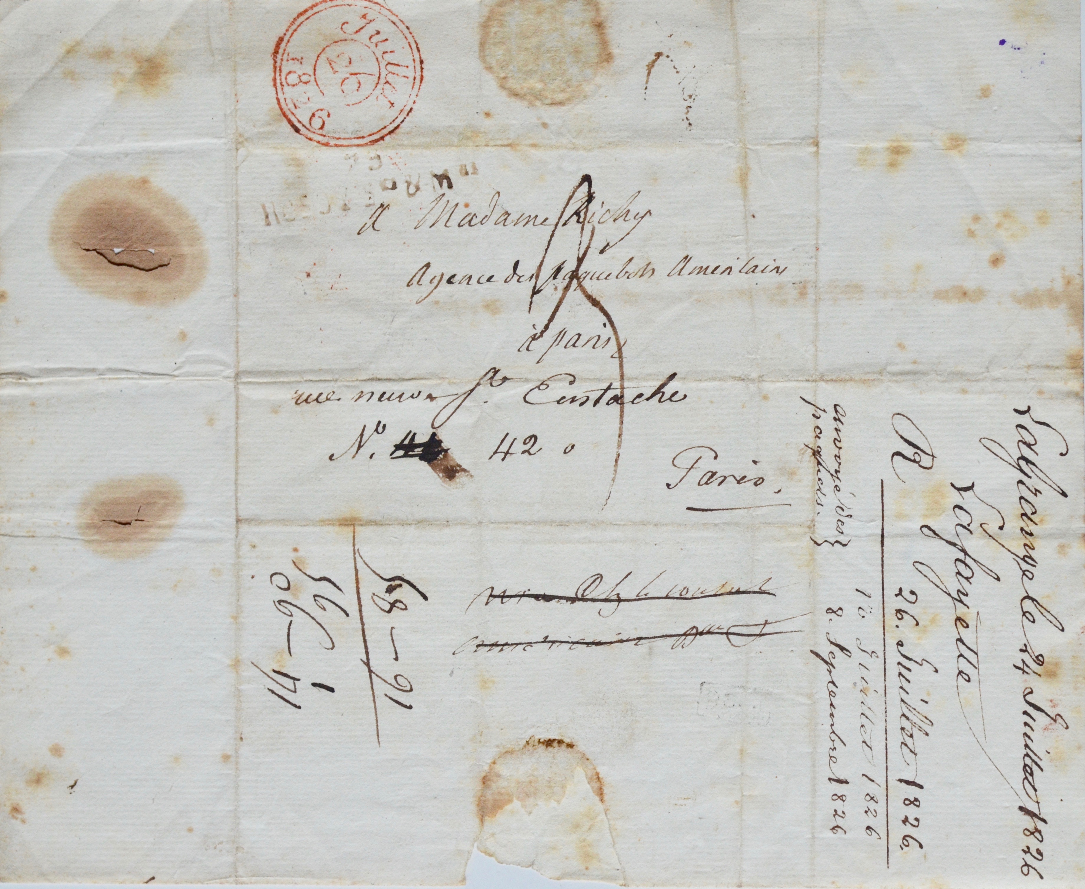 Lettre autographe signée de Gilbert Du Motier de La Fayette, adressée « à Madame Richy [Ritchie ?] agence des paquebots américains à Paris ».