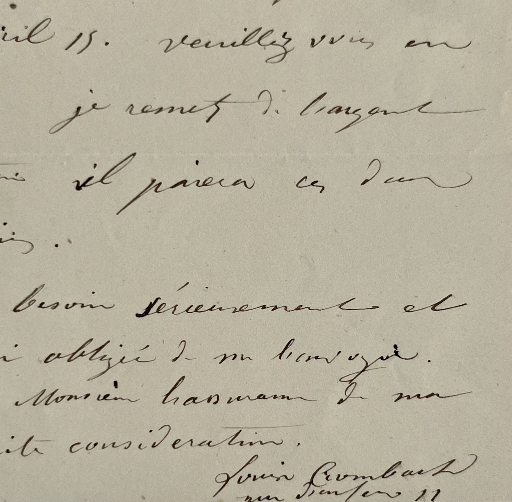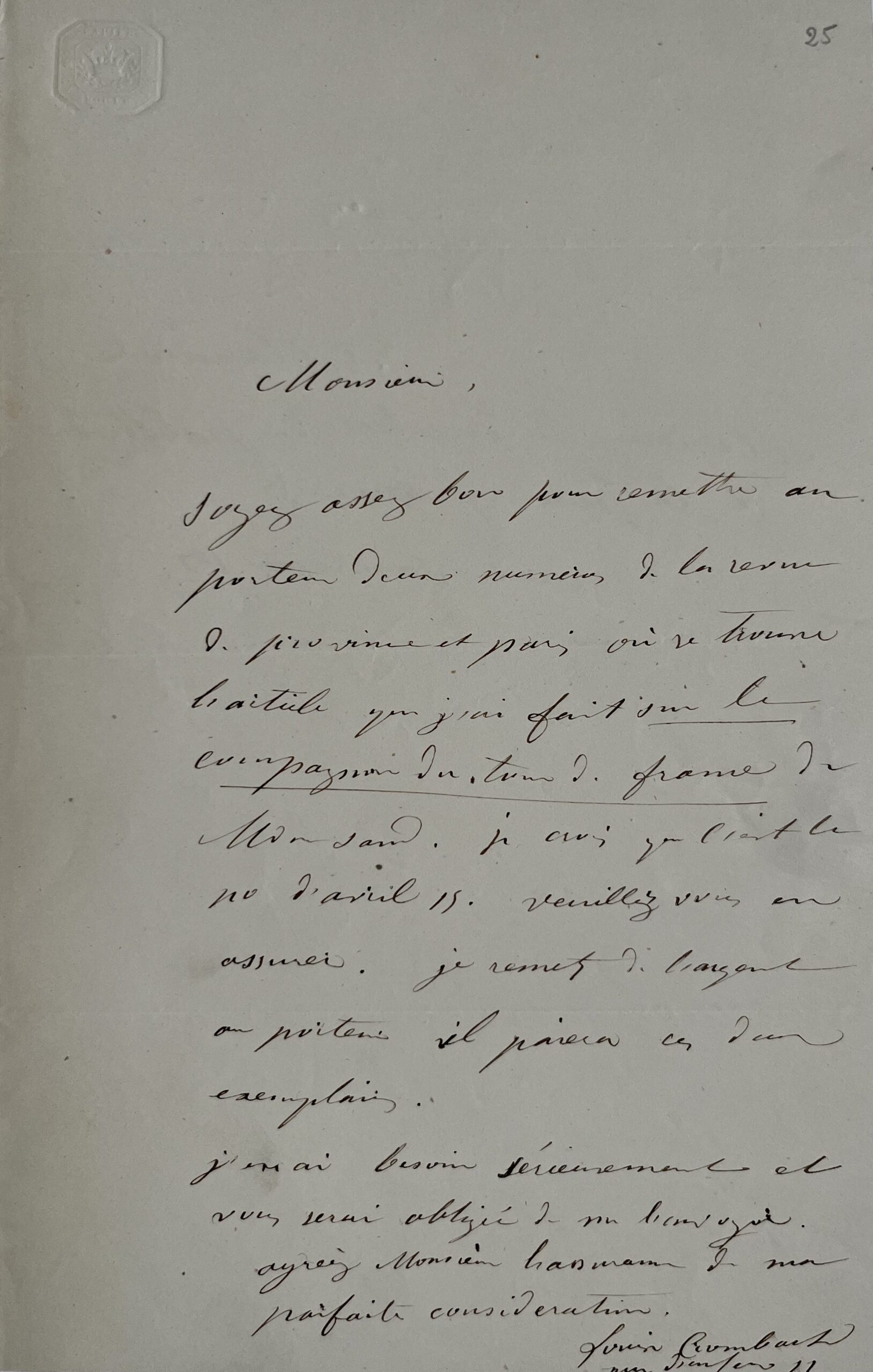 "Soyez assez bon pour remettre au porteur deux numéros de la revue de province et Paris où se trouve l'article que j'ai fait sur le compagnon du tour de France de Mde Sand. Je crois que c'est le numéro d'avril 55. Veuillez vous en assurer. Je remets de l'argent au porteur il paiera ces deux exemplaires. J'en ai besoin sérieusement et vous serai obligée de me l'envoyer [...]".