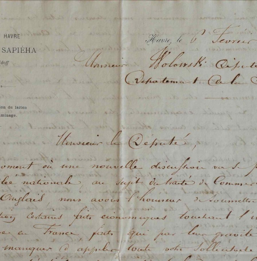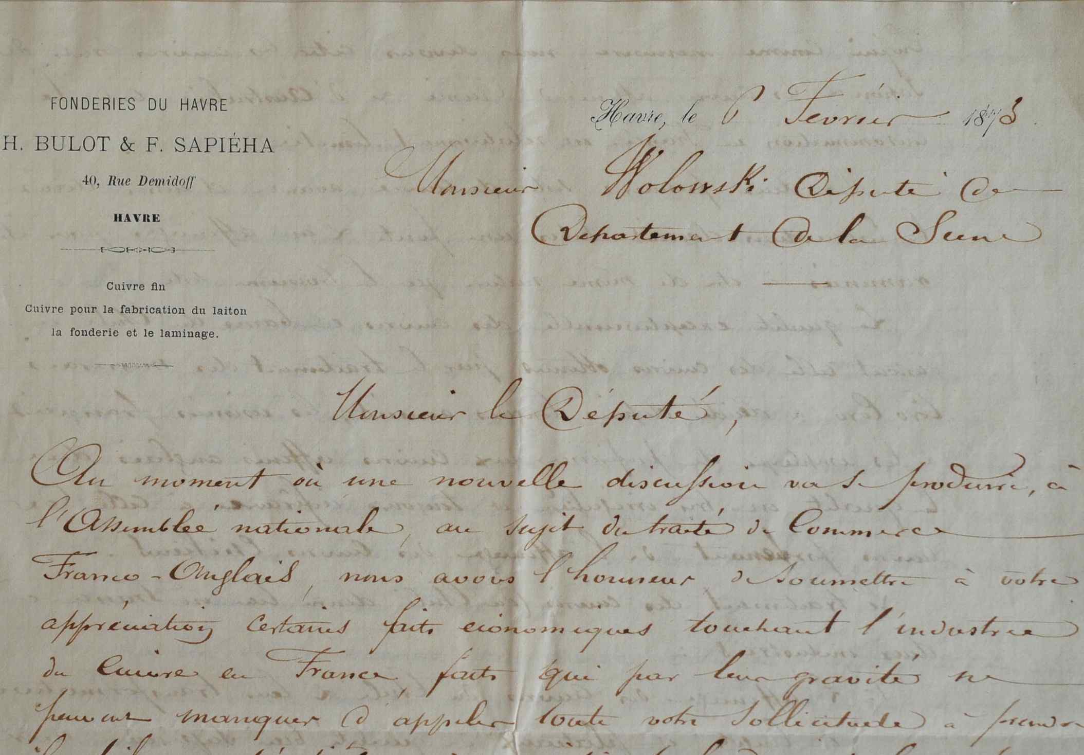 Longue lettre du co-directeur des Fonderies du Havre, F. Sapiéha, [originaire de Lituanie, il dirige les Fonderies du Havre avec H. Bulot, spécialisées dans le cuivre fin et le cuivre pour la fabrication du laiton, la fonderie et le laminage]. Il souhaite informer le député de la Seine Louis Wolowski d'une crise du cuivre : «Au moment où une nouvelle discussion va se produire à l'Assemblée nationale au sujet du traité du Commerce franco-anglais, nous avons l'honneur de soumettre à votre appréciation certains faits économiques touchant l'industrie du cuivre en France, faits qui par leur gravité ne peuvent manquer d'appeler toute votre sollicitude à prendre la défense d'intérêts qui ont été profondément lésés par suite de l'application des surtaxes d'entrepôt aux cuivres bruts.» Il détaille l'origine des cuivres utilisés en France (Chili) et affirme la supériorité des cuivres français sur les cuivres anglais. Il souhaite l'exemption des droits de surtaxe.