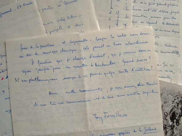 Tony Torrilhon (Paris, 1931/0)Belle correspondance de Tony Torrilhon durant la guerre d'Algérie ; il est alors médecin militaire, et s'occupe de la santé d'un groupe de 650 hommes des armes spéciales, au fond du Sahara. Il évoque à la fois sa vie quotidienne, ses missions et la situation politique du pays. «La pacification me semble une ineptie si c'est pour maintenir les indigènes dans notre dépendance. Il faut qu'ils s'organisent eux-mêmes, qu'ils prennent leurs affaires en mains. Elever ce pays, j'entends ce désert de nomades arriérés, au niveau d'une nation moderne est, je crois, une nécessité. Mais nos solutions françaises ne sont pas valables, ici, dans ces hauts plateaux du Sud-Oranais [...]». Avec divers documents sur sa peinture et ses expositions.