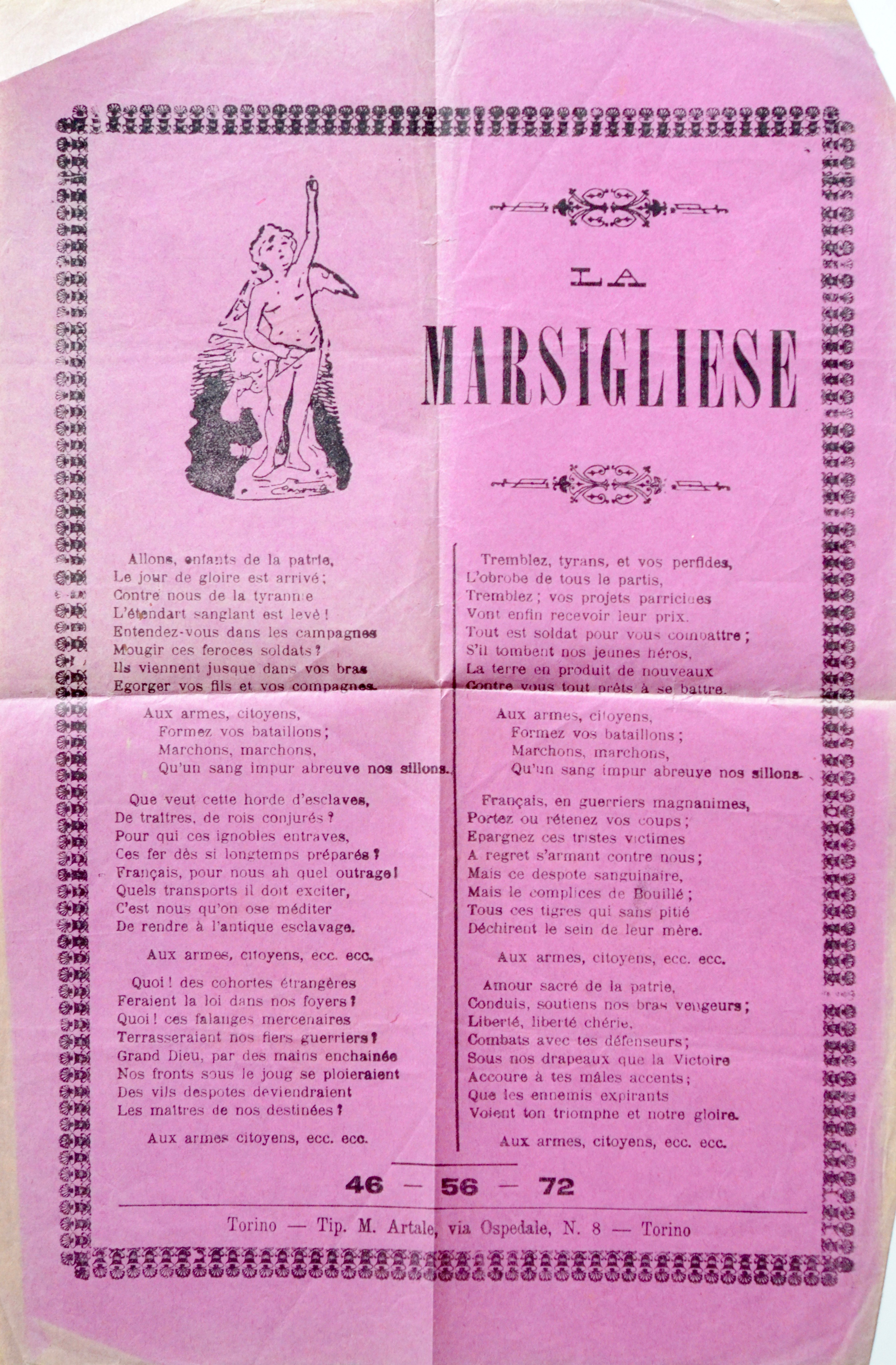 Imprimé italien intitulé "La Marsigliese", contenant les paroles de l'hymne national français, sur papier rose vif.