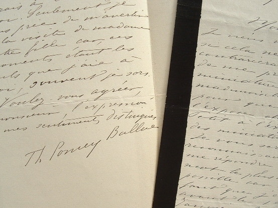 Thérèse Pomey-Ballue fixe à 500 frs le prix d'une miniature «semblable à celle de la petite fille au chapeau rose que vous trouviez ressembler à votre petite fille». Elle lui demande de venir à certaines heures : «ces moments étant les seuls que j'aie à moi, souvent je sors». Dans une seconde lettre, elle demande à ce qu'on lui prête la miniature qu'elle a réalisée : «pour que je l'expose chez Georges Petit à l'exposition des miniaturistes».