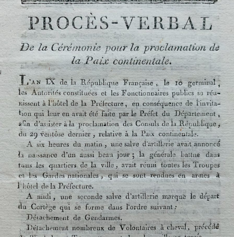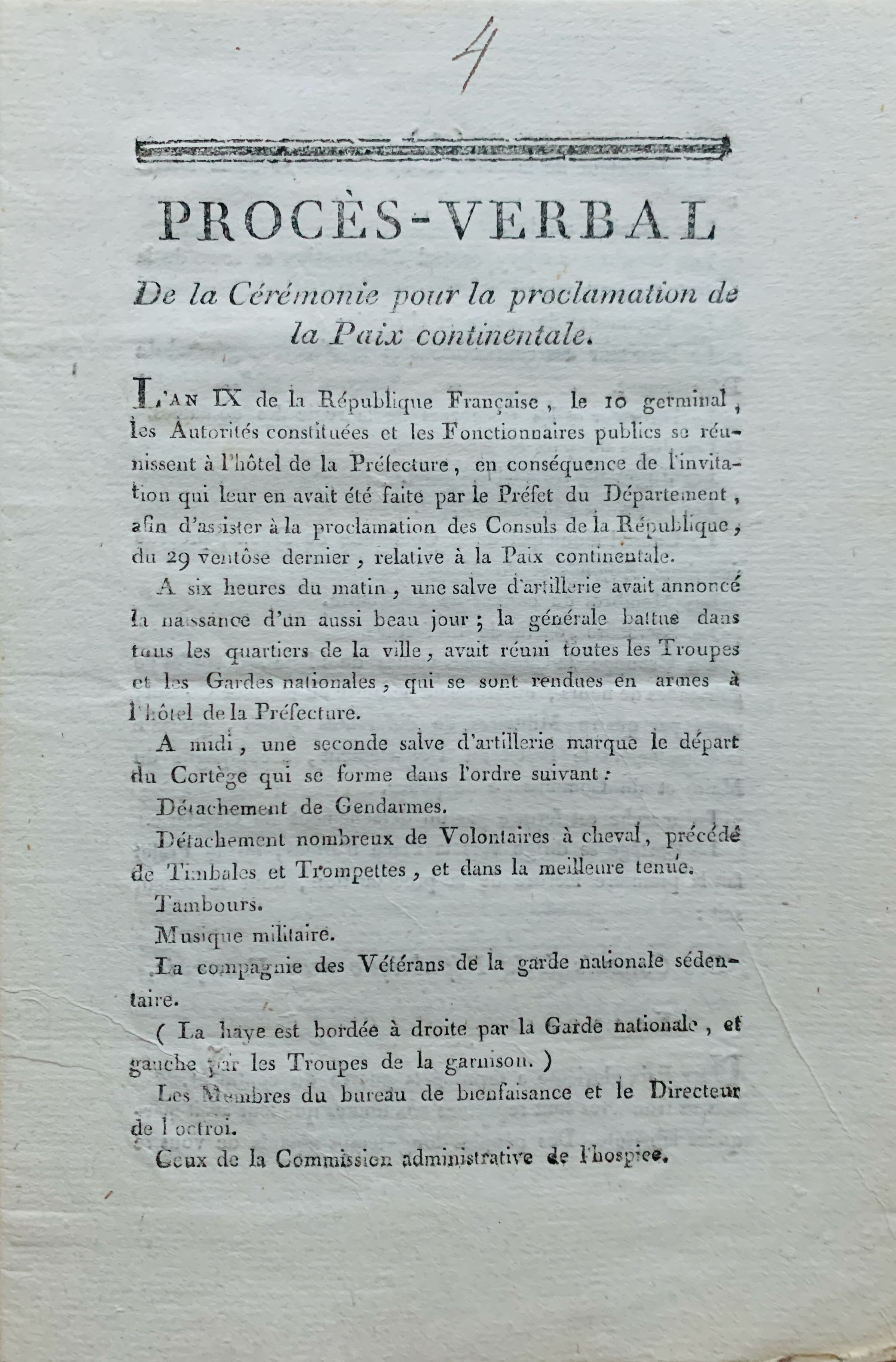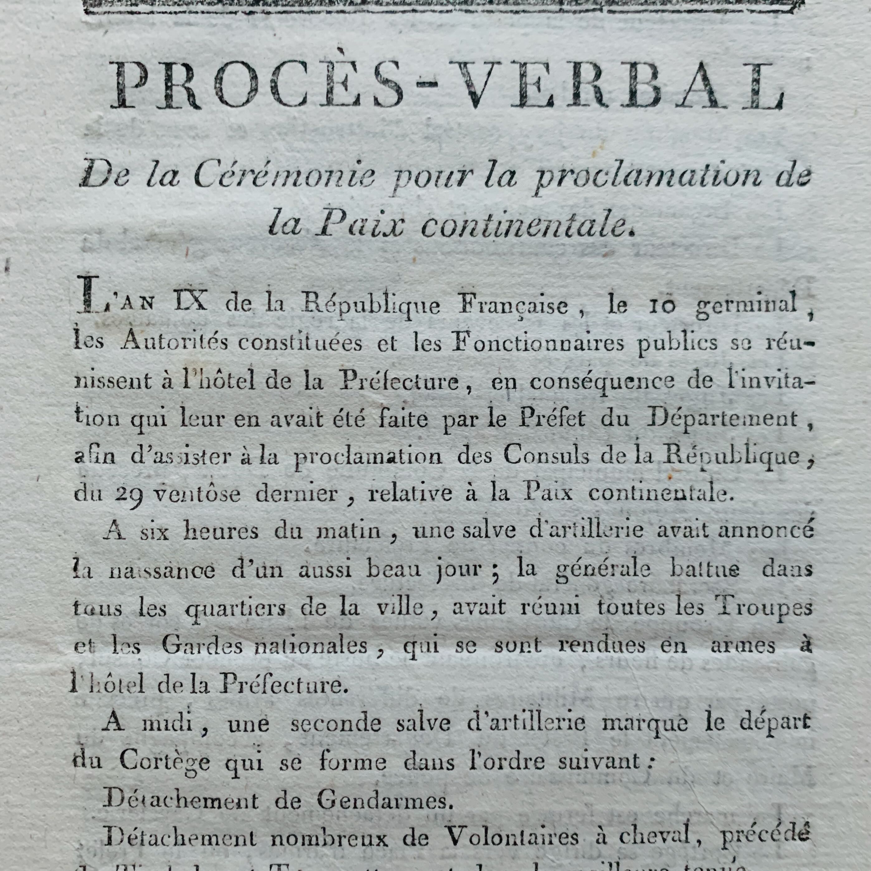 Imprimé : "Procès-verbal de la cérémonie pour la proclamation de la Paix continentale" [paix de Lunéville] qui s'est déroulée à Lille, le 10 germinal an 9.