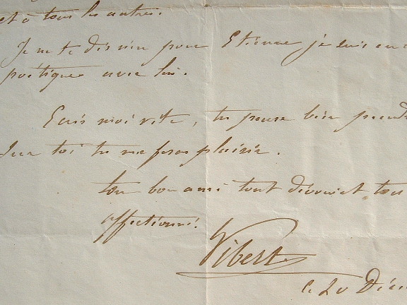 Jehan Georges Vibert (Paris, 1840/1902)Vibert est installé à Cannes et peste contre la corvée d'écriture des lettres. «Je ne fais que cela, c'est la famille qui demande des nouvelles, ce sont les convenances, des lettres que l'on m'envoie et auxquelles il faut répondre, enfin bref, je passe toutes mes soirées à cela. Je viens d'écrire 15 lettres d'un coup [...]». Mais il aimerait avoir des nouvelles de son ami, savoir s'il va à l'atelier, s'il a un tableau en cours. Il donne aussi de ses nouvelles. «Je travaille beaucoup. J'ai deux tableaux en train. Je ne m'amuse pas du tout, mais du tout ; je ne veux pas dire pour cela que je m'ennuie, je reporte toute ma sève sur la peinture, mais ça ne pourra pas durer longtemps comme cela, de la vertu pas trop n'en faut». Son quotidien le ronge également. «Sais-tu que voilà quatre mois que je suis comme un petit Jésus. Je fais des vers et je fume mélancoliquement ma pipe sur le bord de la mer, le soir au clair de lune, en rêvant au bonheur. J'en suis réduit à (délirer ?) dans ma chambre le matin en caleçon, nous faisons en avant deux avec Ernest pendant une demie heure au son d'un mirliton que nous avons fait et, ces jours-là sont nos jours de folie, une folie bien douce comme tu vois. Si ça continue, je finirai par broder des mouchoirs ou me faire des bretelles en tapisserie. Je peins à peu près avec la même tranquillité ; enfin, je ne me reconnais pas [...]». Il ne sort presque pas, prend du ventre et des coups de soleil. «Ma barbe duvette légèrement et folâtre autour de mon menton comme les poils d'une brosse mangée aux vers, enfin je suis charmant». Il demande des nouvelles de l'école et des amis peintres. «J'avais écrit à Leloir pour le féliciter de son second prix, je ne sais pas s'il a reçu ma lettre [...]».