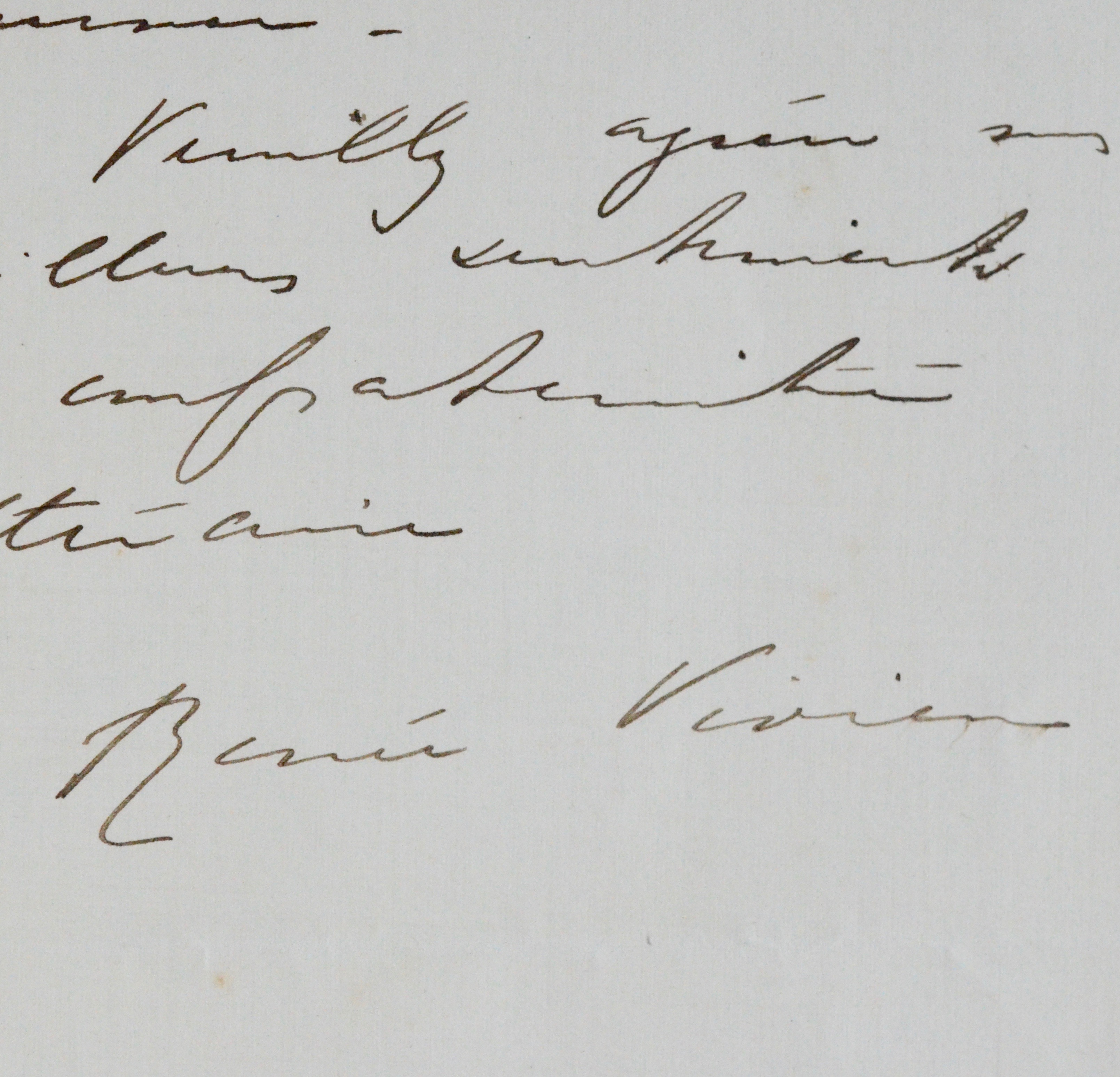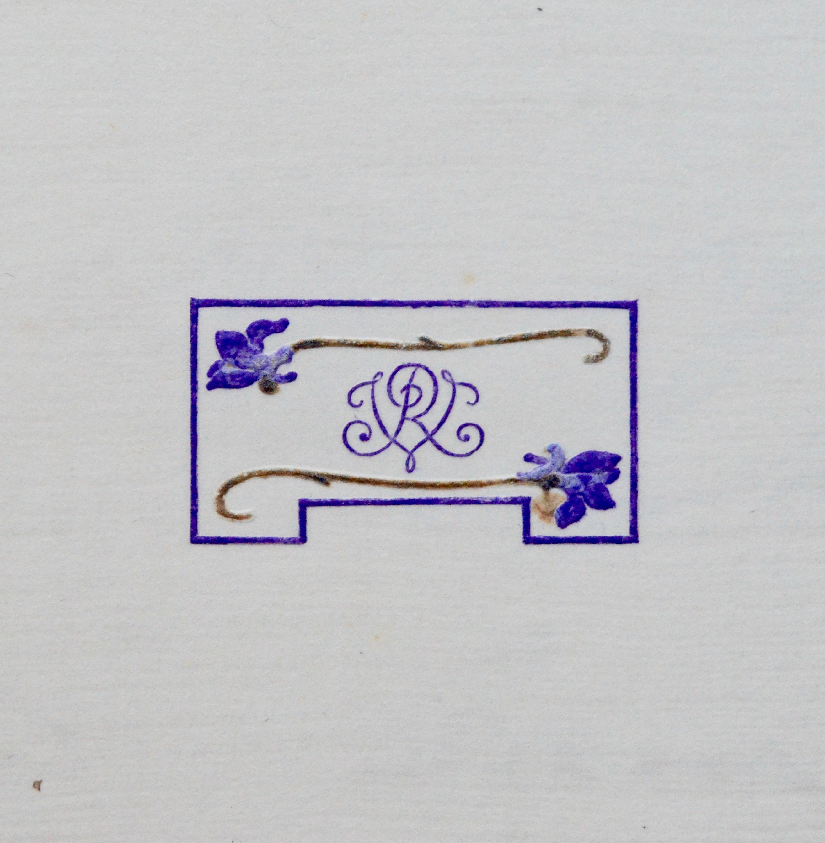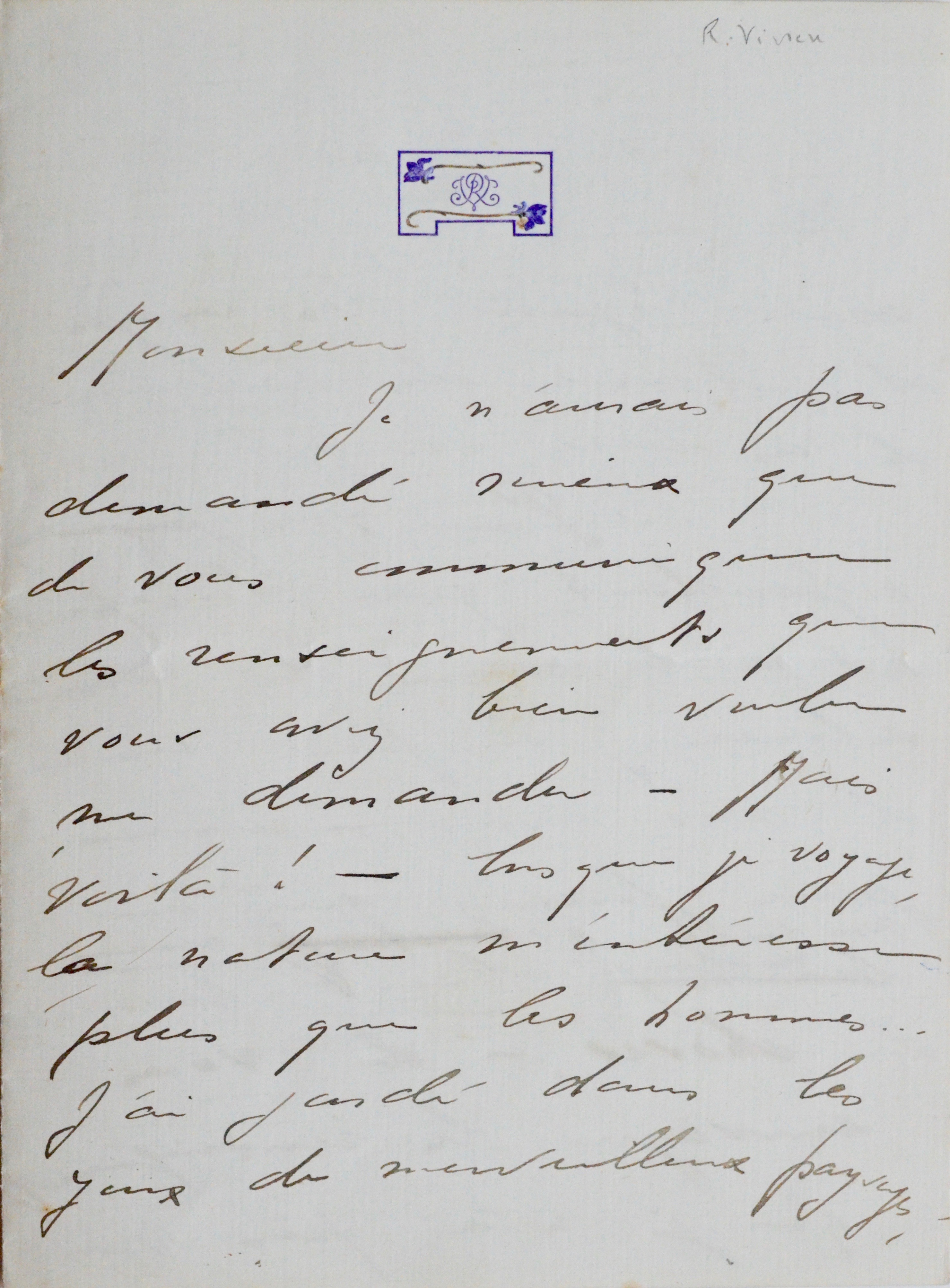 Encre brune sur papier à lettre imprimé de son chiffre, à l'encre violette : les lettres R et V sont entrelacées entre deux violettes, fleurs chères au coeur de Renée Vivien. Surnommée la « Muse des violettes », la poétesse chérissait également la couleur, qui lui évoquait le prénom d'une de ses plus chères amies, Violette Shillito. Lors de sa première tentative de suicide, elle posa un bouquet de ces fleurs sur son coeur.