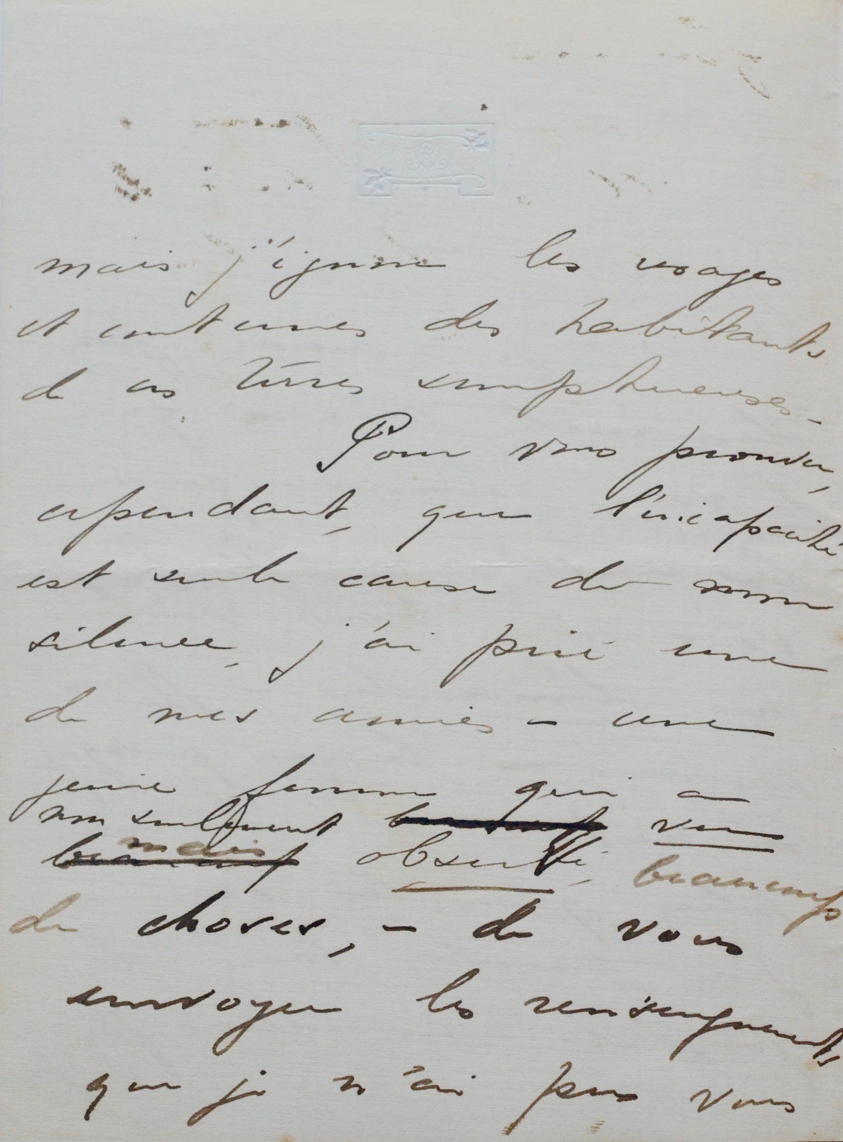 "[...] Je n'aurais pas demandé mieux que de vous communiquer les renseignements que vous avez bien voulu me demander - Mais voilà ! - lorsque je voyage, la nature m’intéresse plus que les hommes... J’ai gardé dans les yeux de merveilleux paysages, mais j’ignore les visages et coutumes des habitants de ces terres somptueuses". L'une de ses amies s'en chargera : "une jeune femme qui a non seulement vu mais observé beaucoup de choses, - de vous envoyer les renseignements que je n’ai pu vous fournir [...]".
