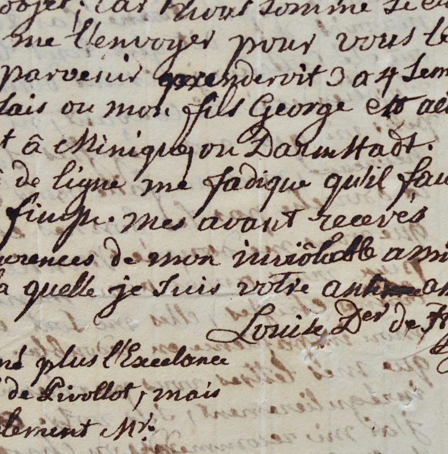 Louise de Hesse-Darmstadt (Berlin, 1757/1830)Louise de Hesse, malade, puise dans ses forces pour écrire sa lettre. "Quoi qu'alitée depuis huit jours pour chasser les humeurs de la goute vollante qui se promène dans tout mon corps sans se fixer, je veux vous avertir que votre lettre ne m'est parvenue que le 26 d. c. [du courant], j'ai tout de suite de mon lit écrit au Plénipotentiare de Prusse et à M. de Pivollot à Ratisbonne [...]. Pivolotte m'a déjà dit que tous les partages ont été conclus, je crains donc que je n'obtiendrai ni couvent, ni abbeÿ [abbaye] [...]". Elle évoque les problèmes de droit de chasse sur ses propriétés. "Je prierai M. de Pivolotte de vous adresser un petit mémoire pour le faire parvenir au Premier Consul [...]".