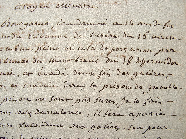 Lettre du substitut du commissaire du Directoire exécutif près les tribunaux civil et criminel de l'Isère, Gautier. Il annonce qu'Ennemond Bourgarut, condamné à 14 ans de fer et à la déportation par les tribunaux de l'Isère et du Mont-Blanc, évadé à deux reprises des galères, a été arrêté et conduit dans les prisons de Grenoble. "Comme ces prisons ne sont pas sûres, je le fais traduire dans celles de Valence ; il sera à portée soit pour être reconduit aux galères, soit pour être déporté [...]". Il adresse son signalement et le jugement. "Vous m'autorisates, l'année dernière, à faire traduire à Lyon dans la maison d'arrêt St Joseph, les condamnés aux fers qui engorgeoient la prison de Grenoble ; si le même engorgement arrivoit, je vous prie de m'autoriser à les faire conduire dans celles de Valence, parce qu'ils se trouveront plus à portée de la mer [...]".