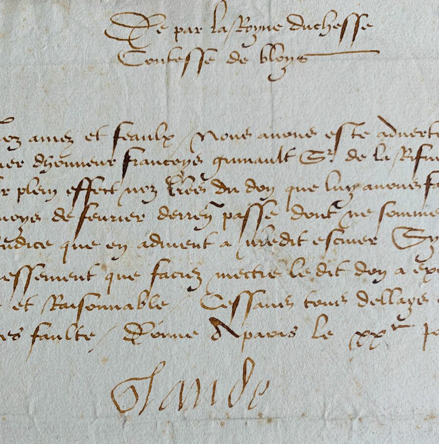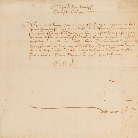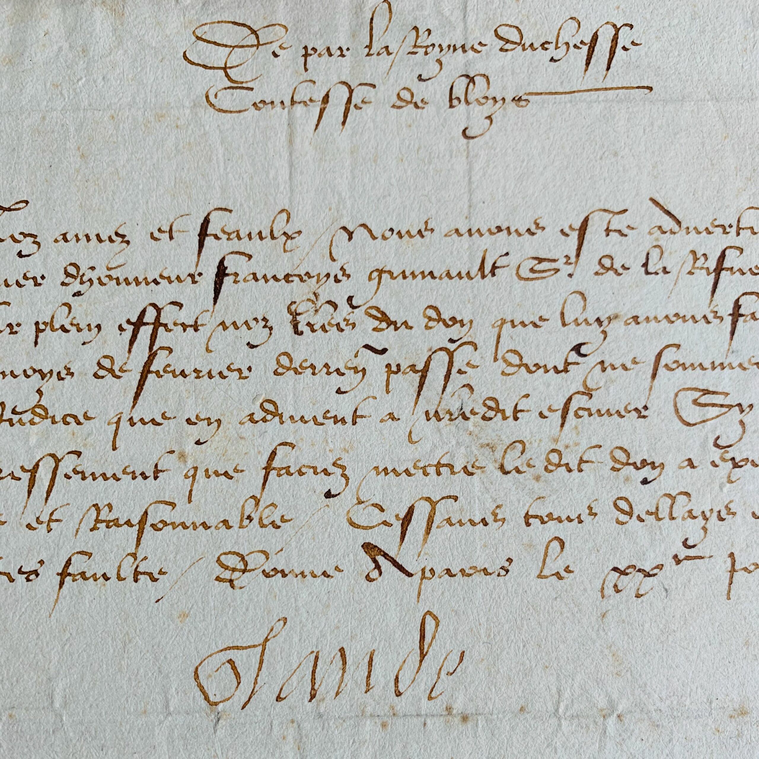 Claude de France (Romorantin, 1499/1524)La reine Claude de France, qui était aussi comtesse de Blois (de 1514 à 1524), se plaint auprès de ses comptables de Blois et les menace si ses ordres ne sont pas diligemment exécutés.