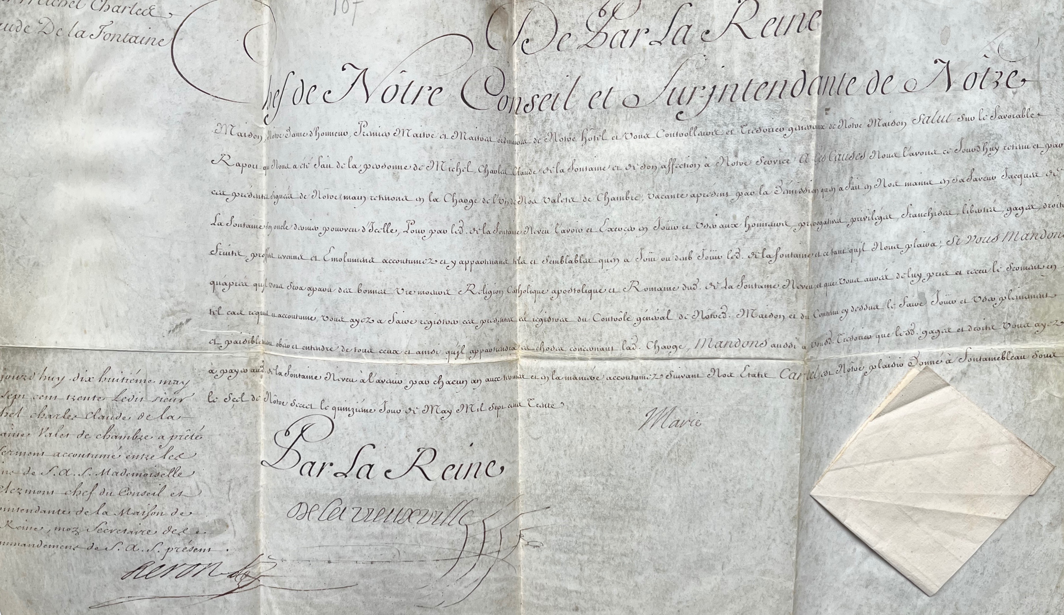 Brevet de nomination de Michel Charles Claude de La Fontaine au poste de valet de chambre de la Reine, suite à démission de Jacques de La Fontaine, son oncle.