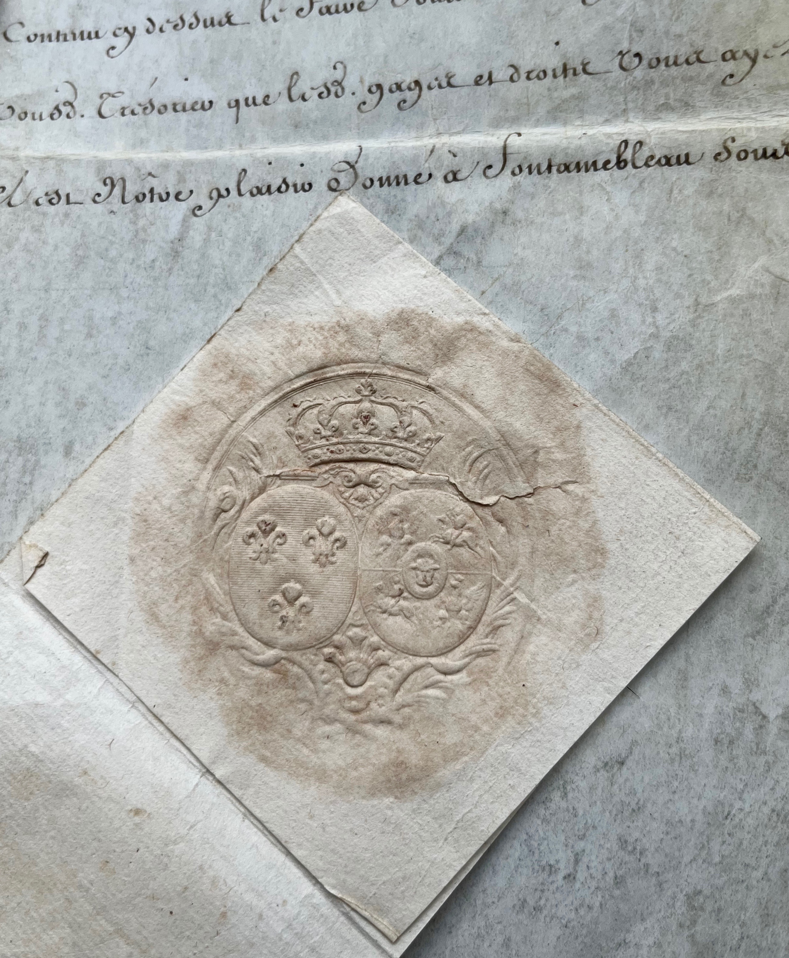 Beau sceau sous papier aux armes de Marie Leszczynska : d'azur aux trois fleurs de lys d'or (France) et écartelé en 1 et 4 de Pologne, qui est de gueules, à l'aigle d'argent, becquée, languée, membrée, liée et couronnée d'or et en 2 et 3 de Lituanie qui est de gueules, à un chevalier, armé de toutes pièces d'argent, monté sur un cheval galopant du même, bridé d'or, caparaçonné d'azur, tenant de sa main dextre une épée et de sa senestre un bouclier ovale d'azur chargé d'une croix de Lorraine d'or, sur le tout de Leszczyński, qui est d'argent à la tête de buffle de sable accorné et annelé d'or (armes de Stanislas Ier Leszczynski, roi de Pologne).