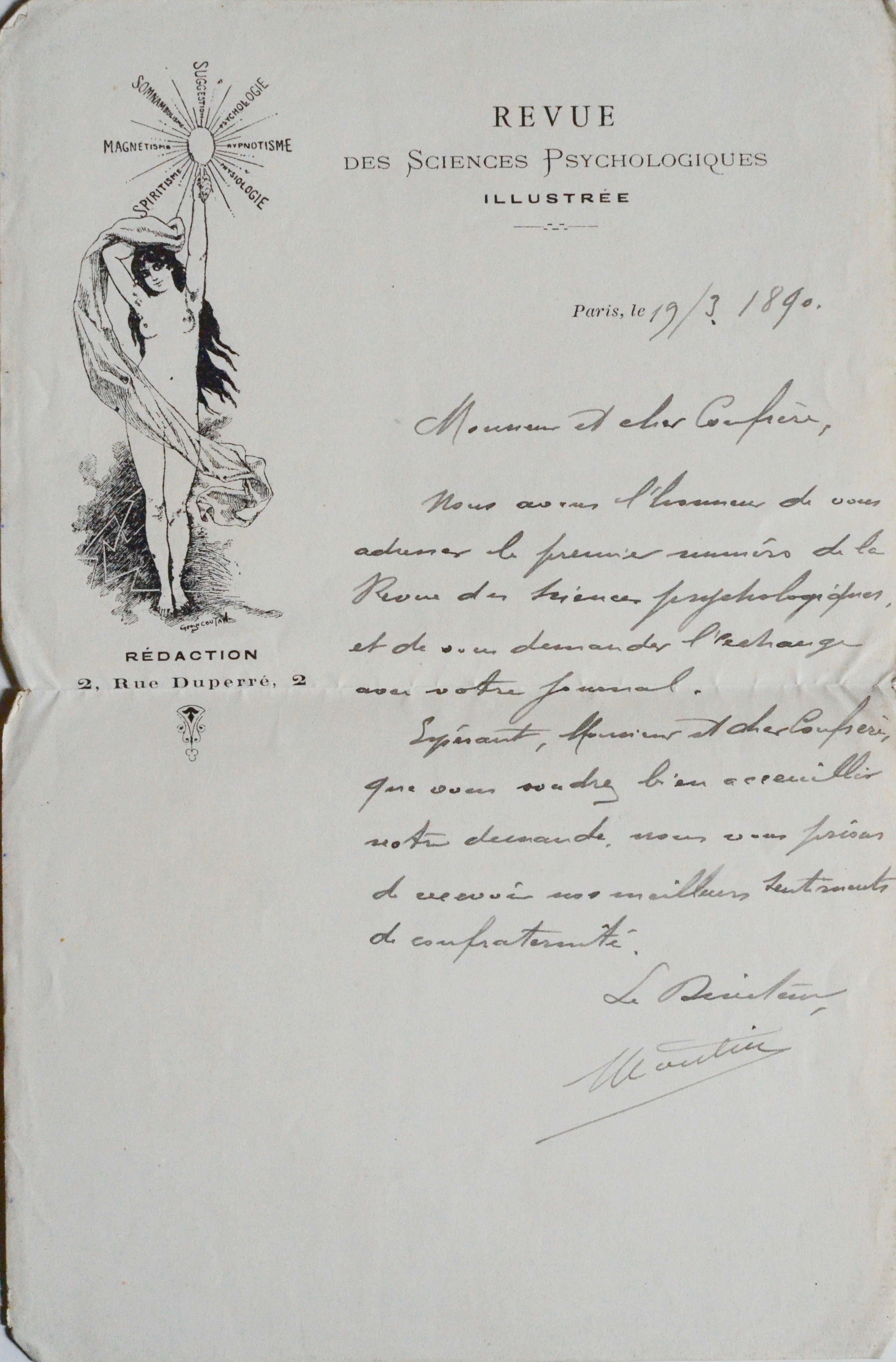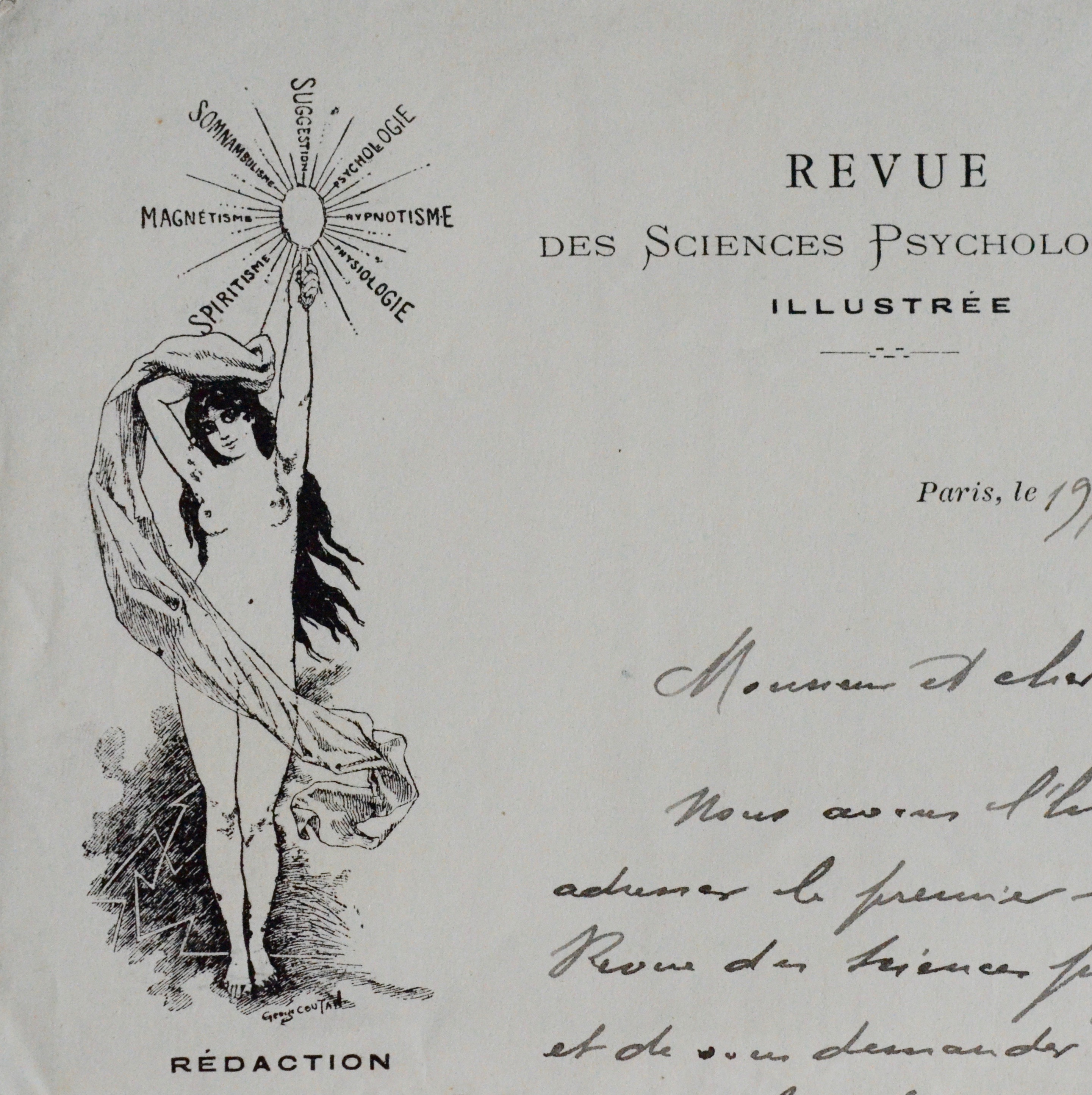 Encre noire sur double feuillet de papier vergé filigrané "Original India Mill". En-tête de la Revue des Sciences psychologiques illustrée : une belle femme nue tenant un miroir d'où rayonnent les mots magnétismes, spiritisme, hypnotisme, somnambulisme, etc.
