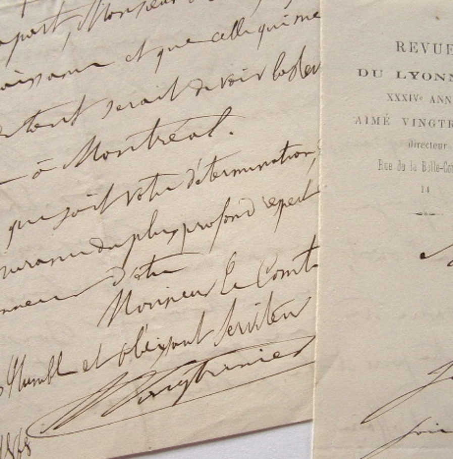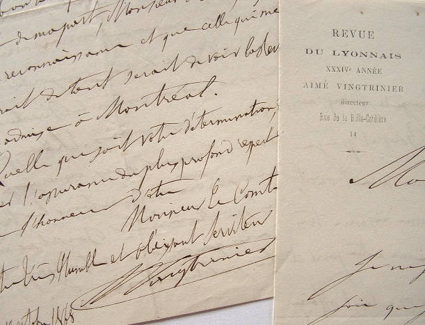 Aimé Vingtrinier (Lyon, 1812/1903)Deux lettres de l'emblématique directeur de la Revue du Lyonnais, Aimé Vingtrinier, sur le désengagement de son correspondant, le propriétaire du château de Montréal. «Chef de la famille la plus considérable de nos pays, historien vous-même, vous retirez votre bienveillance à une Revue dévouée à l'histoire de notre province. Je redoutais tellement cette détermination, par une préscience qui n'appartient qu'aux prophètes et aux sorciers, que je n'avais pas osé, cette année, vous faire parvenir votre quittance d'abonnement [...]». Il évoque une affaire issue de l'impression d'un mémoire, dont personne ne veut acquitter le paiement. Finalement, son correspondant revient sur sa décision. «Je ne puis vous exprimer la joie que j'ai ressentie en apprenant que le château de Montréal continuerait à accorder une gracieuse hospitalité à la Revue du Lyonnais [...]».