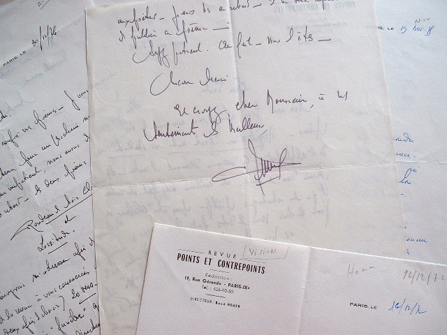 Jean Loisy (Paris, 1901/1992)4 lettres de René Hener, directeur-fondateur de la revue de poésie Points et Contrepoints, et 13 lettres de Jean Loisy, rédacteur en chef. Correspondance relative à la publication de poèmes dans la revue, et aux difficultés que rencontre l'édition de la poésie. Ils font part de leurs commentaires à leur auteur. «[...] Mais votre Ballade de l'alphabet est un très beau poème, même s'il rappelle Rimbaud [...]. Vos poèmes me plaisent et me touchent par leur sens humain et comique, par la souple rigueur de leur prosodie [...]. J'ai vivement admiré cette Ode qui témoigne d'une rare maîtrise et d'une grande force de pensée et d'expression [...]. Je ne cesse de déplorer le silence qui entoure tant d'ouvrages remarquables, alors que nous sommes saturés de médiocrité imprimée, jouée, chantée [...]. Le sort des poètes a toujours été difficile. Je me demande s'il a jamais été pire, surtout lorsqu'ils ne négligent pas les ressources de la prosodie traditionnelle [...]. J'apprécie particulièrement votre alphabet. Savez-vous que Henry-Jacques a écrit, lui aussi, un alphabet ? Le votre, comme le sien, est imprévu, émouvant. On devrait demander à tous de s'essayer sur ce thème qui excite l'imagination et révèle la personnalité [...]. Je prendrai volontiers connaissance de quelques poèmes satiriques. Toutefois, je vous signale que les goûts de notre fondateur-directeur ne sont guère orientés de ce côté là [...]». Jean Loisy évoque aussi la mort de la revue, survenue avec celle de son fondateur et des difficultés de l'édition poétique. «J'ai été très sensible à vos regrets devant la disparition de notre vieille revue où l'on se plaisait à vous accueillir [...]. Le dernier numéro de "P. et C.", qui nous a valu bien des difficultés, est, hélas, l'ultime ; et "Sourires" a disparu de même pour les mêmes raisons : problèmes financiers, fatigue du directeur maintenant très âgé. Peut-être pourriez-vous risquer l'envoi de quelques brefs poèmes, de ma part, à madame Renée Garcia, directrice de "Cerf Volant" [...] bien qu'elle même connaisse des difficultés [...]».