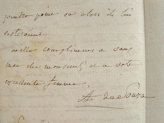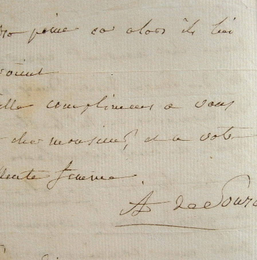«Mr de Souza désire deux exemplaires des Mémoires de Mr le Cte de Ségur, et deux exemplaires de Mr son fils de : Napoléon et la grande armée. Comme c'est pour une commission, il les désire avec la remise, et il les lui fait demain soir 30 janvier [...]».
