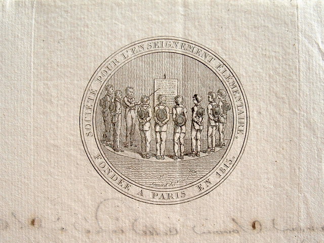 Très jolie vignette gravée, signée Jomard, de la Société pour l'enseignement élémentaire, fondée à Paris en 1815.