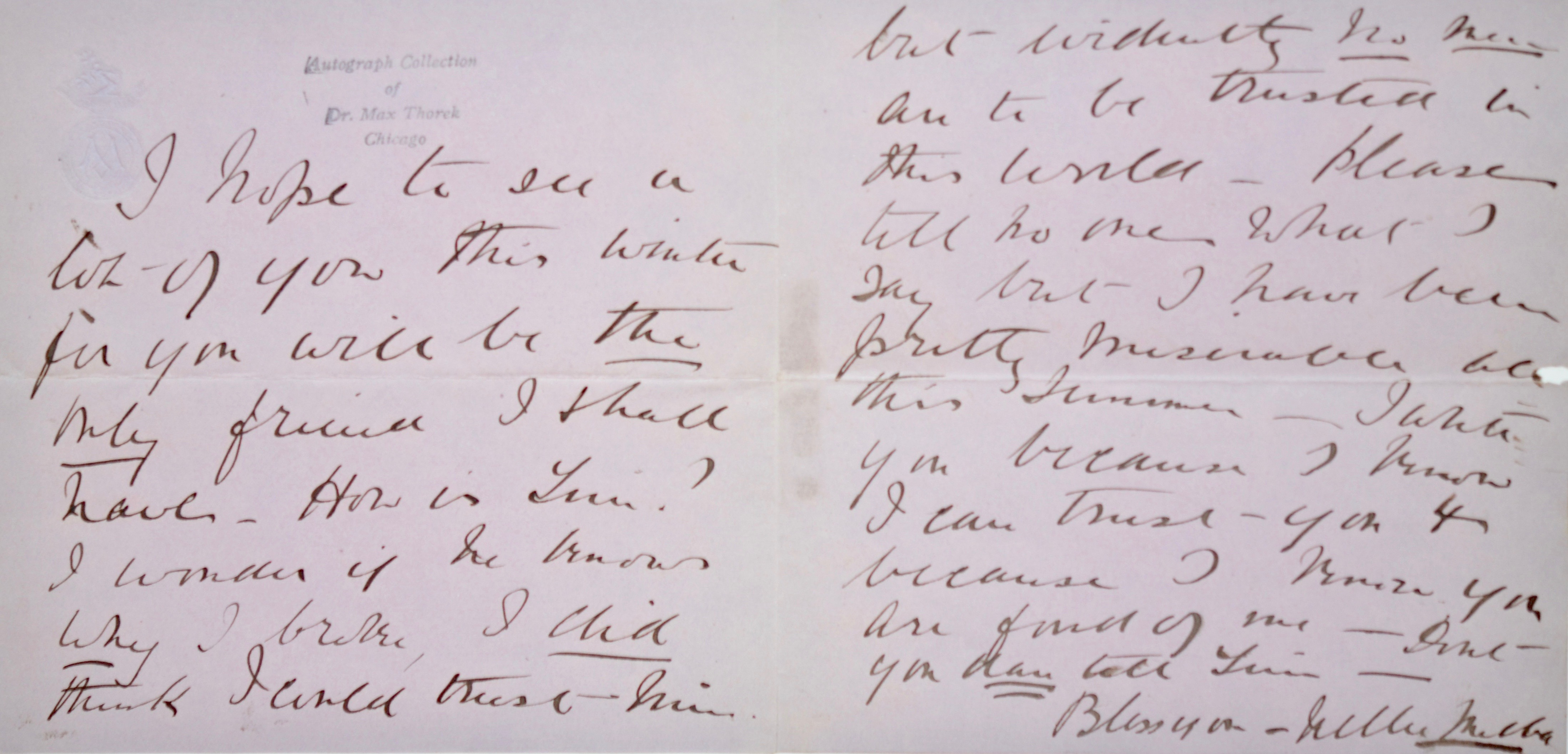 Amicale lettre de la soprano Nellie Melba (celle dont Escoffier emprunta le nom pour son fameux dessert). "I was so glad to get your nice letter & sincerely hope you are now quite yourself again. I arrive about the 20th November & hope to see you directly I arrive, as I have many things to talk to you about. I am very well & am just starting off for a tour in the English provinces [...]. You will be the only friend I shall have [...]".
