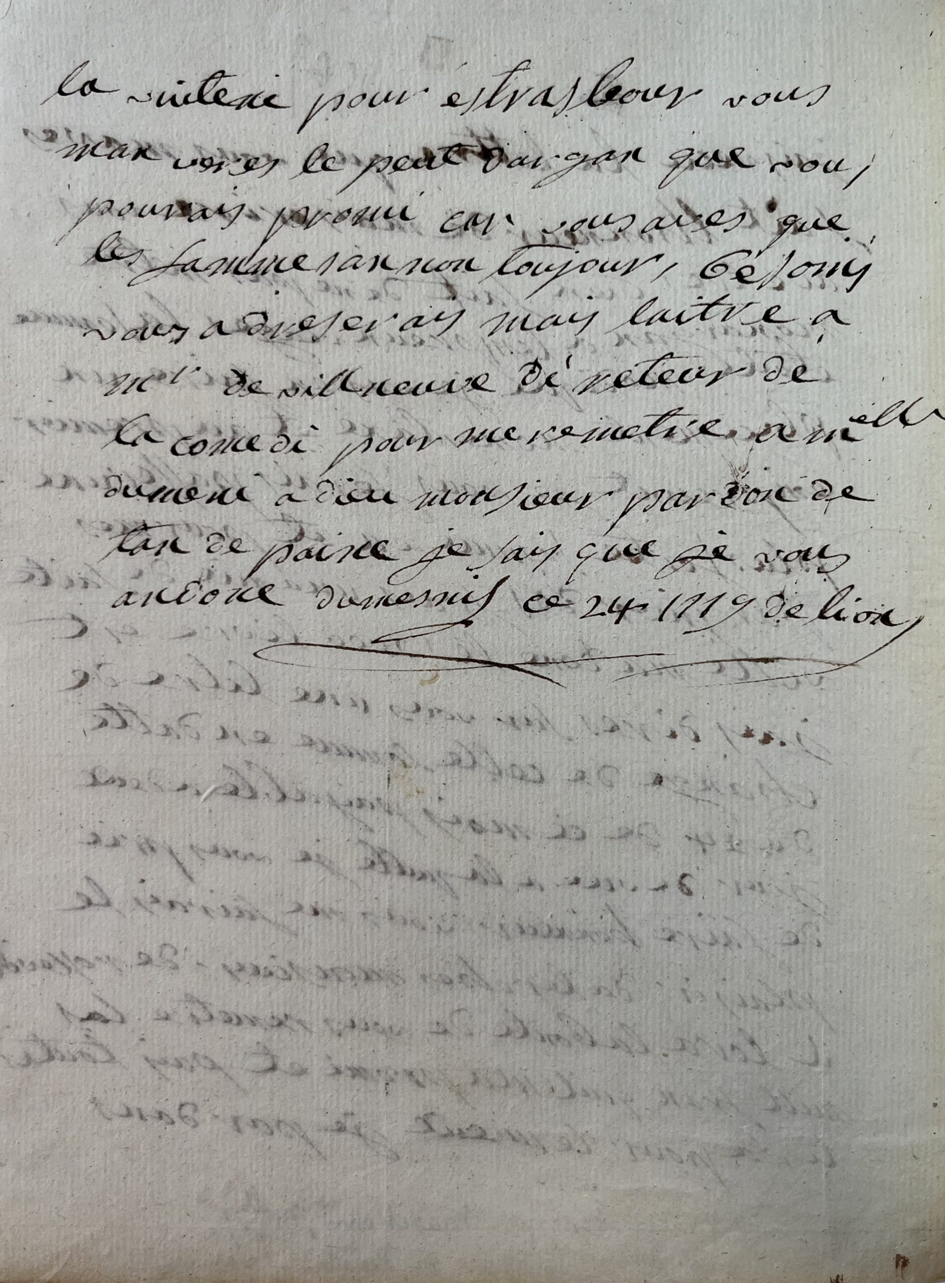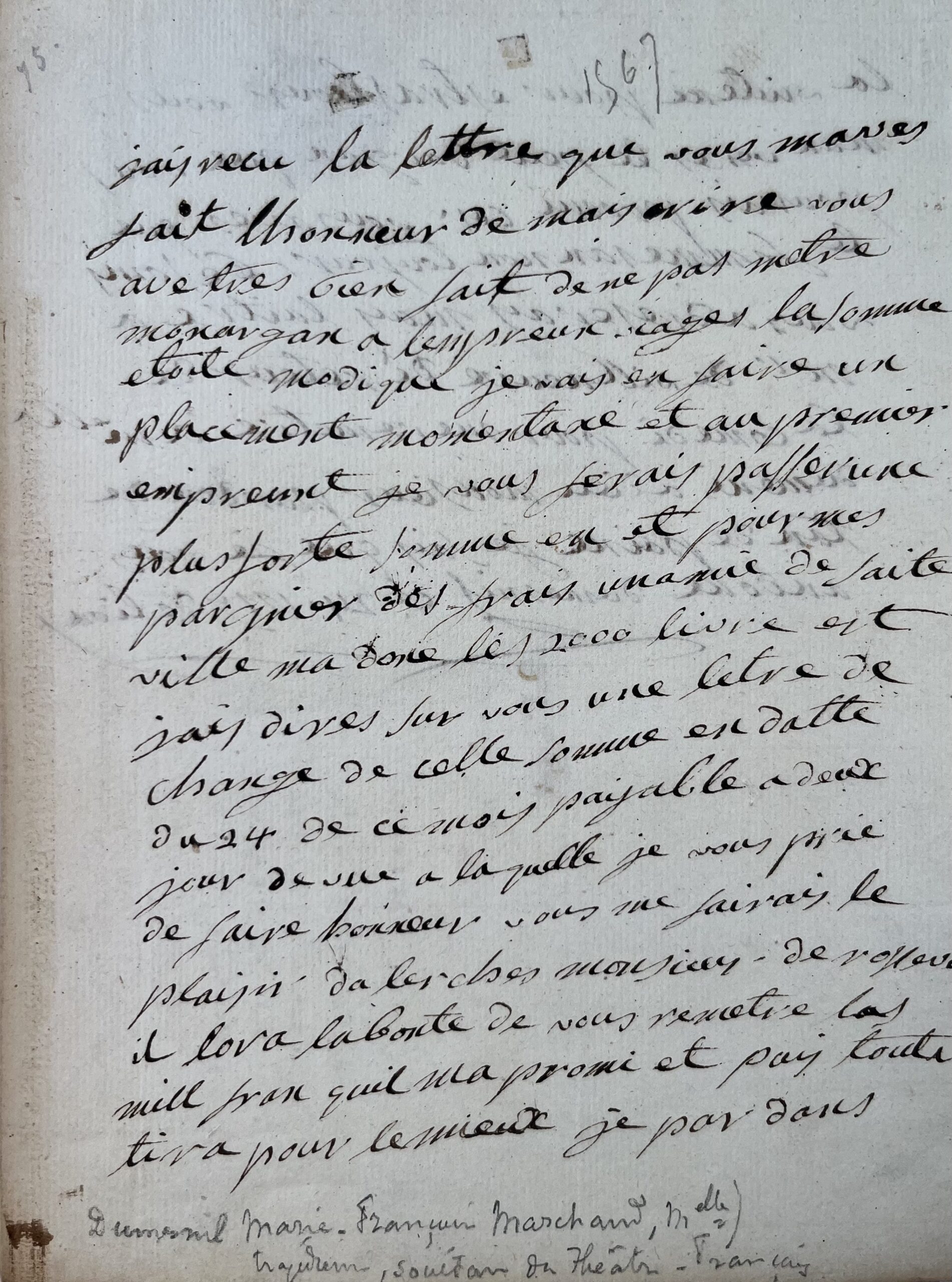 "Jai recu la lettre que vous maves fait lhonneur de maiscrire vous ave tres bien fait de ne pas metre mon argent a lempreun viages la somme etoite modique je vais en faire un placement [...]". Elle lui fera passer ultérieurement une plus forte somme par lettre de change, et l'invite à aller chercher une autre somme de mille francs chez M. de Rosseville. Elle prépare son départ pour Strasbourg, et lui demande de répondre "à Mr de Villeneuve de retour de la comédie pour me remettre à Mlle dumeni [...]".