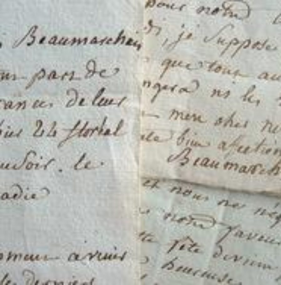 Trois lettres de Marie-Thérèse de Willer-Mawlas (décédée en 1816) dernière épouse de Beaumarchais (il l'avait rencontrée en 1774, l'épousa une première fois en 1786, puis une seconde en 1797). «Votre oncle et ami Beaumarchais et votre tante vous font part de la cessation des souffrances de leur soeur et belle-soeur hier 22 floréal an 6 à 8 heures et demie du soir, le 44e jour de sa maladie». Elle l'invite à les rejoindre «en habit convenable» et précise qu'il «faut chercher Me Delepine avec précaution, afin de sauver une trop forte secousse à notre pauvre soeur et belle-soeur». Une seconde lettre laisse percevoir l'état de misère dans lequel se trouve la famille Beaumarchais à la fin de la Révolution. «Depuis longtemps, mon ami, nous avions aboli l'usage des billets, parce que les billets ont l'air d'un ton, qu'ils annoncent des préférences et que ces préférences nous ont valu des scènes très désagréables». Elle renonce à accueillir M. et Mme D'Ossuna. «Nous regrettons, ma fille et moi, que les cruelles circonstances ne nous permettent pas de leur faire les honneurs de ce jardin, bien déchu de sa première splendeur. Depuis que notre jardin est devenu le dépôt de tout ce qui nous est cher, nous l'avons fermé indistinctement, mais il sera ouvert pour vos frais débarqués de Hollande». Elle lui adresse deux places. «Comme c'est décadi, je suppose que ce jour lui convient mieux que tout autre [...]». Dans une dernière, signée Ve Beaumarchais, elle évoque un voyage très fatiguant et sa difficile situation. «Ma fille, mon gendre et moi, nous acceptons avec grand plaisir votre invitation ; vous êtes un excellent neveu, et pour tout dire un charmant homme. Nous tâcherons de vous faire honneur et nous ne négligerons rien pour intéresser en notre faveur vos importants convives. Cette fête devient pour nous une fortuité bien heureuse. Hélas, il ne s'agit pas aujourd'huy d'être riches, mais au moins de n'être pas ruinés sans ressources ; de payer nos créanciers, d'honorer la mémoire de ton oncle».