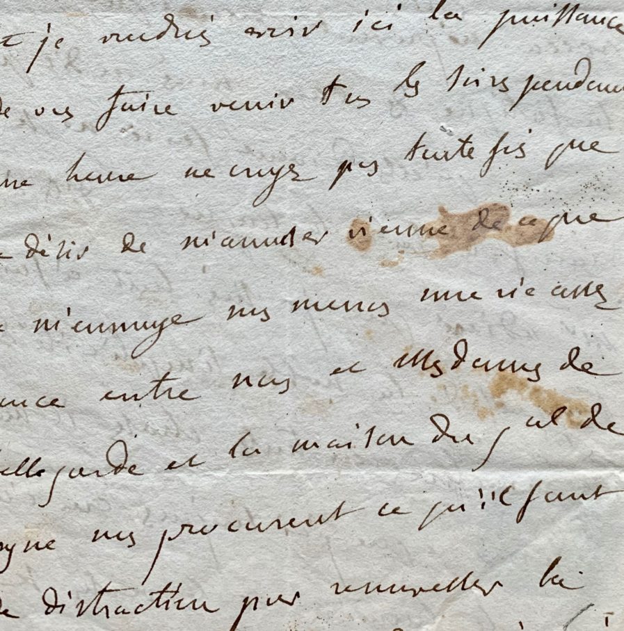 Germaine de Staël (Paris, 1766/1817)Charmante lettre autographe (non signée) de Germaine de Staël à son amie genevoise Adrienne Odier-Lecointe. Malheureusement un peu tachée.