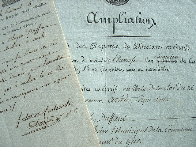 Nomination de Jean Duffau comme officier municipal de la commune d'Auch, signée par Bénézech, ministre de l'Intérieur. Quelques mois après, le président de l'administration municipale lui adresse une lettre le remerciant «des soins que vous vous êtes donnés pour l'exécution de la fête des victoires qui a eu lieu le 10 du courant».