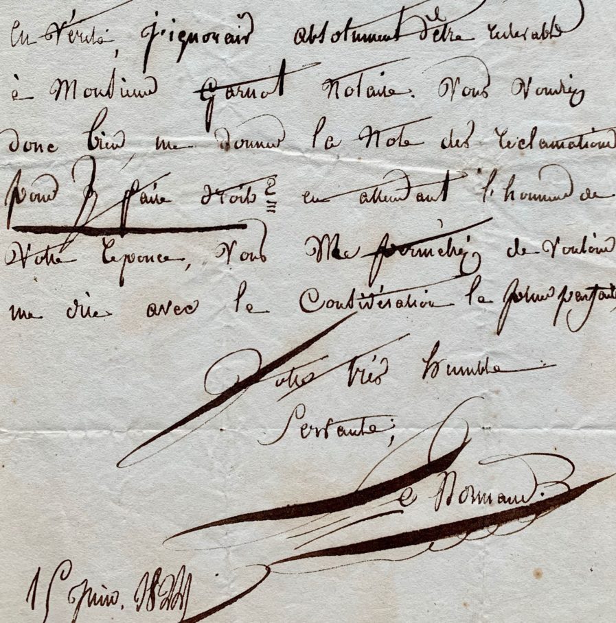 "En vérité, j'ignorais absolument d'être redevable à monsieur Garnot notaire. Vous voudriez donc bien me donner la note des réclamations pour y faire droit? En attendant l'honneur de votre réponse [...]".