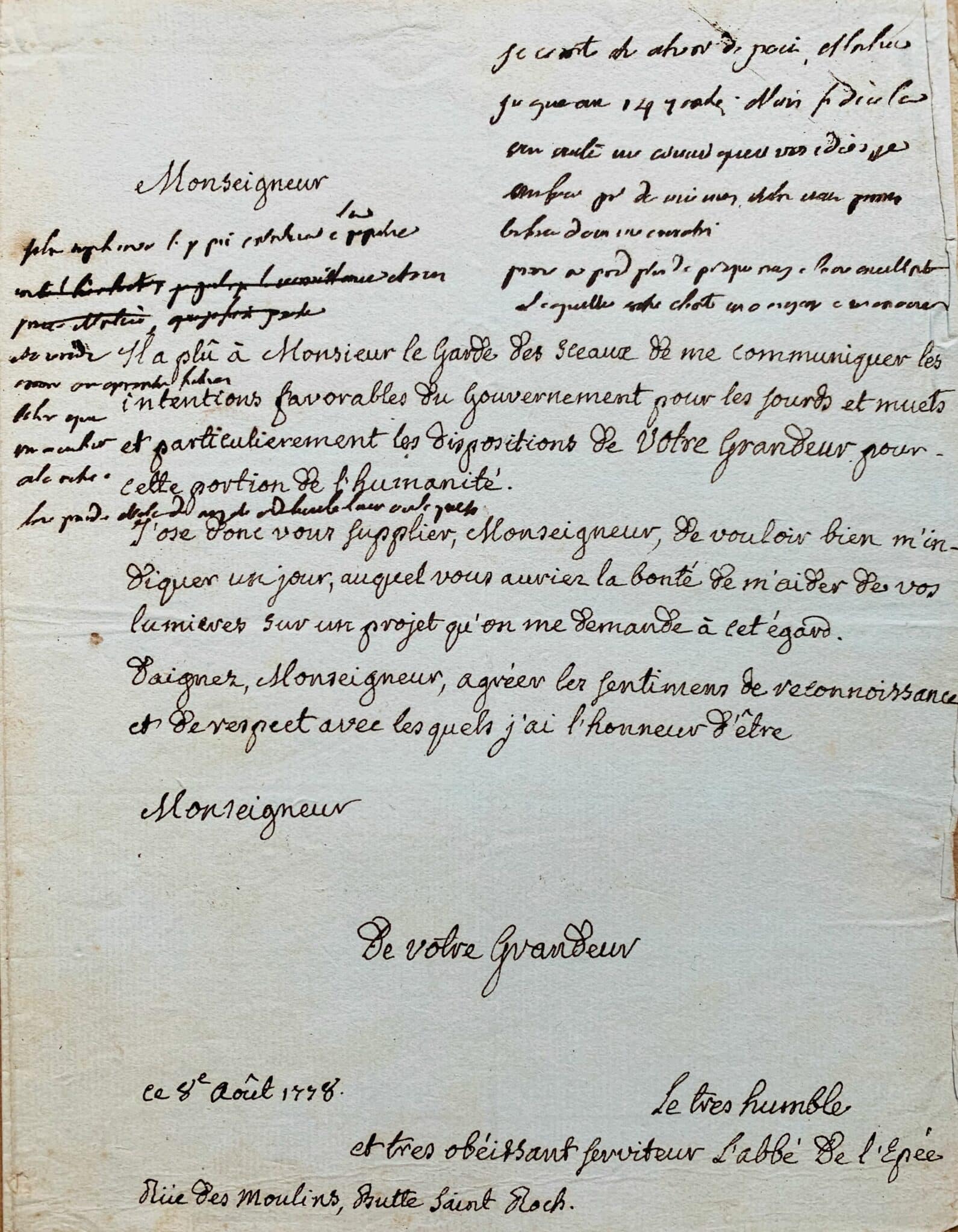 Cette lettre adressée à "monseigneur", en août 1778, s'inscrit dans ce contexte. "Il a plu à Monsieur le Garde des Sceaux de me communiquer les intentions favorables du Gouvernement pour les sourds et muets et particulièrement les dispositions de Votre Grandeur pour cette portion de l'humanité. J'ose donc vous supplier, Monseigneur, de vouloir bien m'indiquer un jour, auquel vous auriez la bonté de m'aider de vos lumières sur un projet qu'on me demande à cet égard [...]".