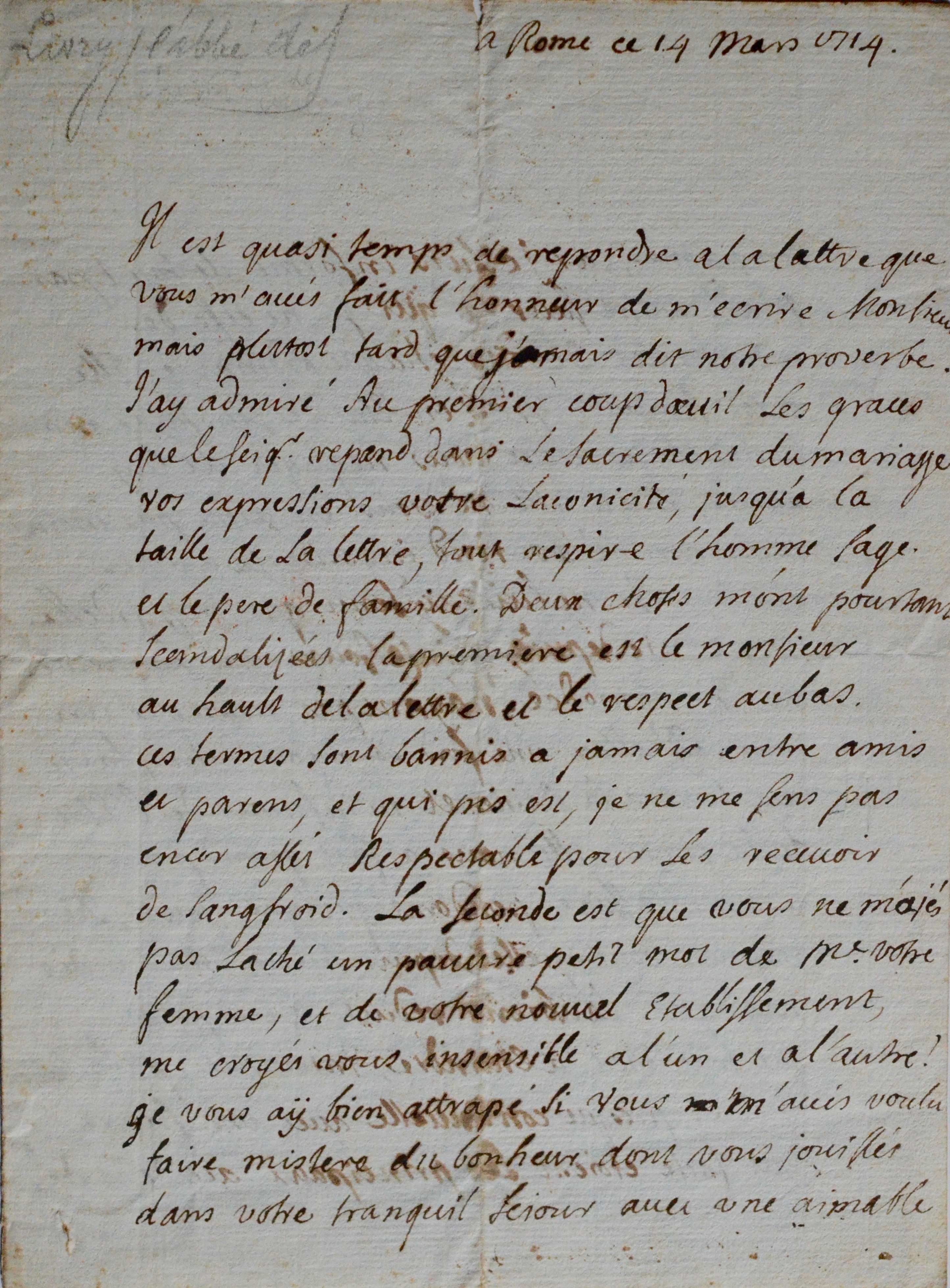 François Sanguin de Livry (1680/1729)Intéressante lettre de l'abbé François Sanguin de Livry (1680-1729), alors ambassadeur de France à Rome.
