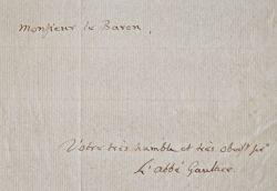 Louis (Aloïsius) Gaultier (abbé) (Asti, 1746/1818)Belle lettre de l'abbé Gaultier, pédagogue, qui consacra toute sa vie à l'éducation des enfants, au moment où il démissionne du Comité des méthodes [il s'était rendu à Londres pour y étudier la méthode d'enseignement mutuel appliqué dans les écoles de Bell et de Lancaster et, à son retour, avait été nommé membre (puis président) de la Commission constituée à la réorganisation de l'instruction primaire]. "Je suis d'avis que le comité des méthodes ne peut rien prononcer sur la lettre de Mr de Chantrans. Le comité peut porter un jugement sur un ouvrage, mais non point sur une simple annonce. Le manuel pour les écoles de campagne était commencé : il a été suspendu par l'incertitude qui a paru régner sur les suites à donner à la proposition faite avec tant de zèle par l'illustre secrétaire de la société. Le brouillon en est entre les mains de Mr Nion qui s'est chargé de le rédiger [...]". Il évoque ensuite le rapport sur l'installation de l'école de Mme Truttel, et poursuit : "Il me semble que le mémoire de Mr de Jussieu contient la réponse aux diverses autres observations que vous avez eu la bonté de m'adresser. Je vous serais infiniment obligé de vouloir bien renvoyer ce mémoire au Comité des méthodes. J'écris en même temps au secrétaire de ce comité pour le prier de faire choisir aux membres qui le composent, un Président qui me remplace, comme j'ai remplacé moi-même jusqu'ici Mr Gallois [...]. Ma santé, mon âge, mes occupations particulières ne me permettent plus de me charger de l'examen des pièces nombreuses qui arrivent à ce comité. Je me ferai néanmoins un vrai plaisir de seconder mes collègues dans quelques affaires particulières, et de consacrer à l'oeuvre utile à laquelle ils se livrent, les fruits du peu d'expérience que j'ai pu acquérir dans une vie passée au milieu des enfants auxquels je suis déterminé de consacrer encore exclusivement le peu qui me reste de force [...]".