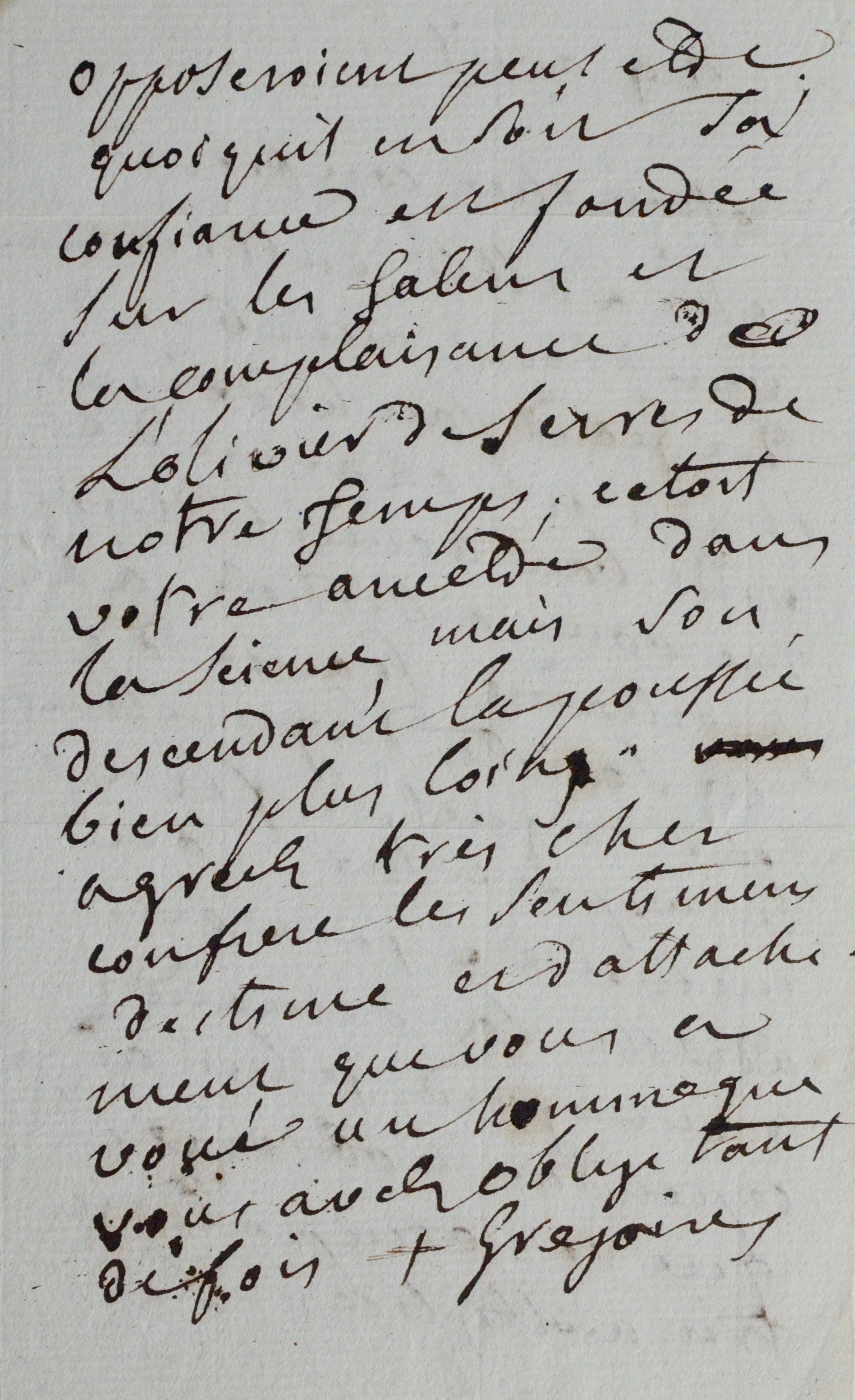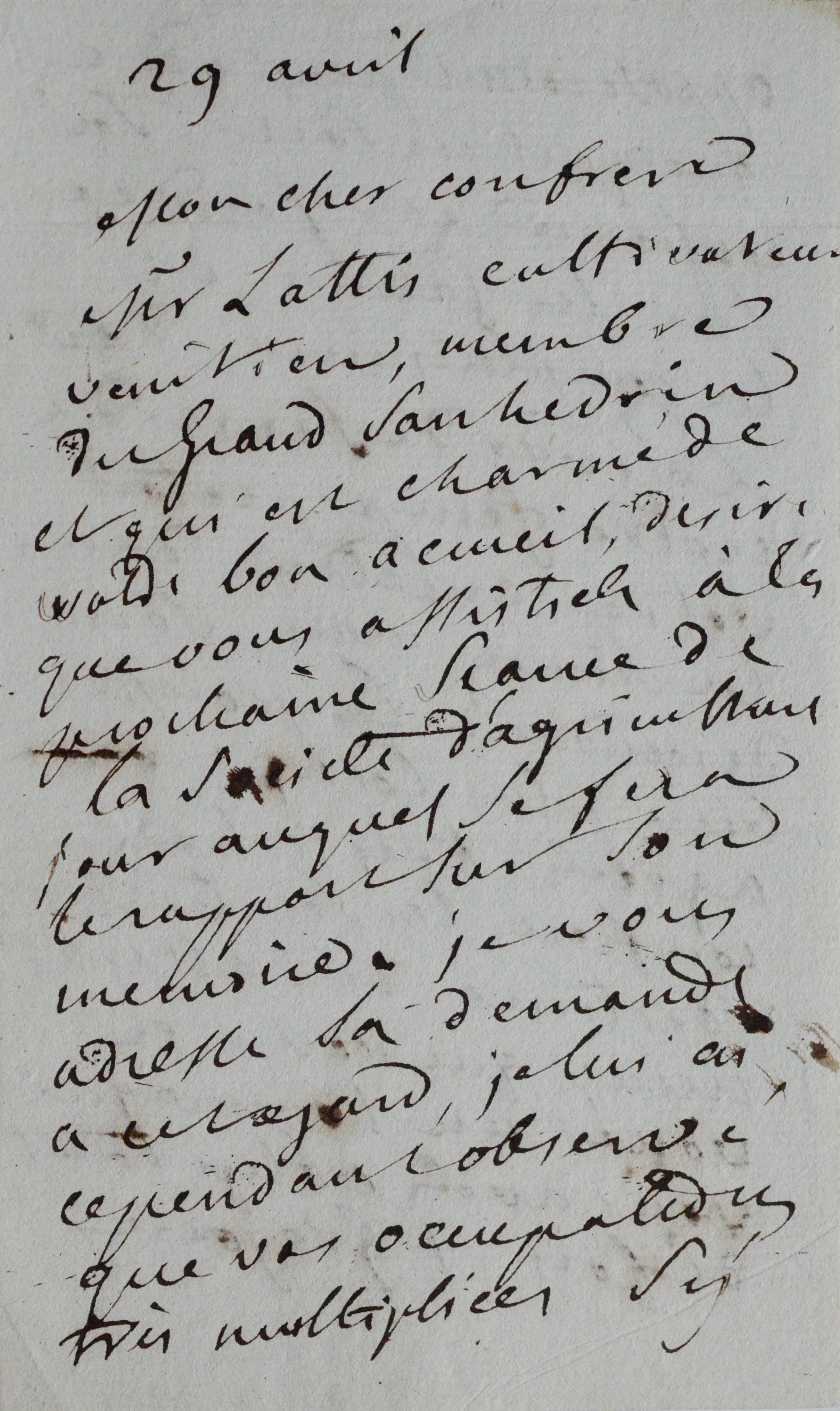 Flatteur courrier de l'abbé Grégoire adressé au botaniste André Thouin : "[...] Mr. Lattis cultivateur venitien, membre du Grand Sanhédrin et qui est charmé de votre bon accueil, désire que vous assistiez à la prochaine séance de la Société d'agriculture" durant laquelle sera lu le rapport du mémoire de ce botaniste. "Je lui ai cependant observé que vos occupations très multipliées s'y opposeroient peut être ; quoi qu'il en soit sa confiance est fondée sur la valeur et la complaisance de l'Olivier de Serres de notre temps ; c'étoit votre ancêtre dans la science mais son descendant la poussée bien plus loin [...]".