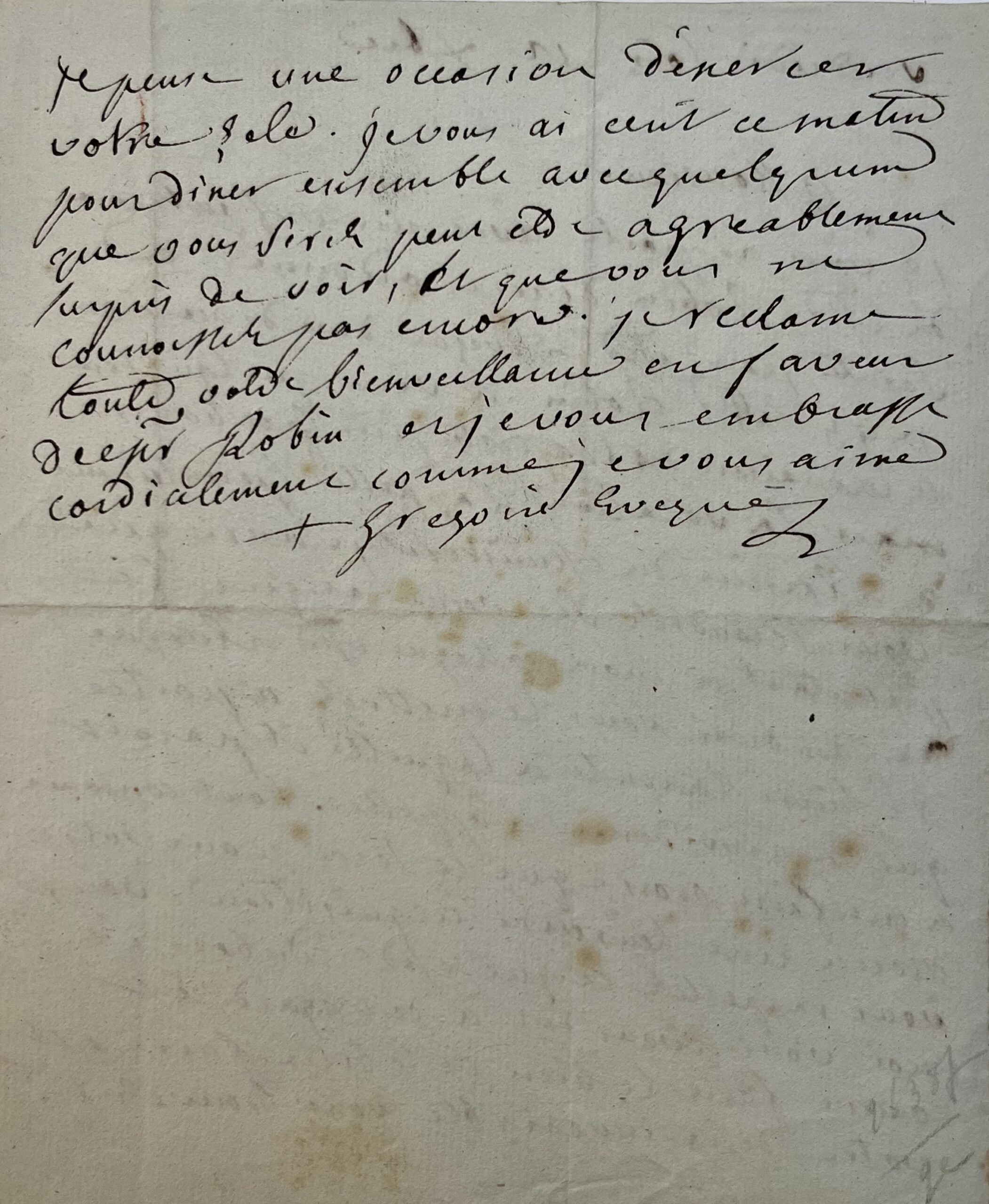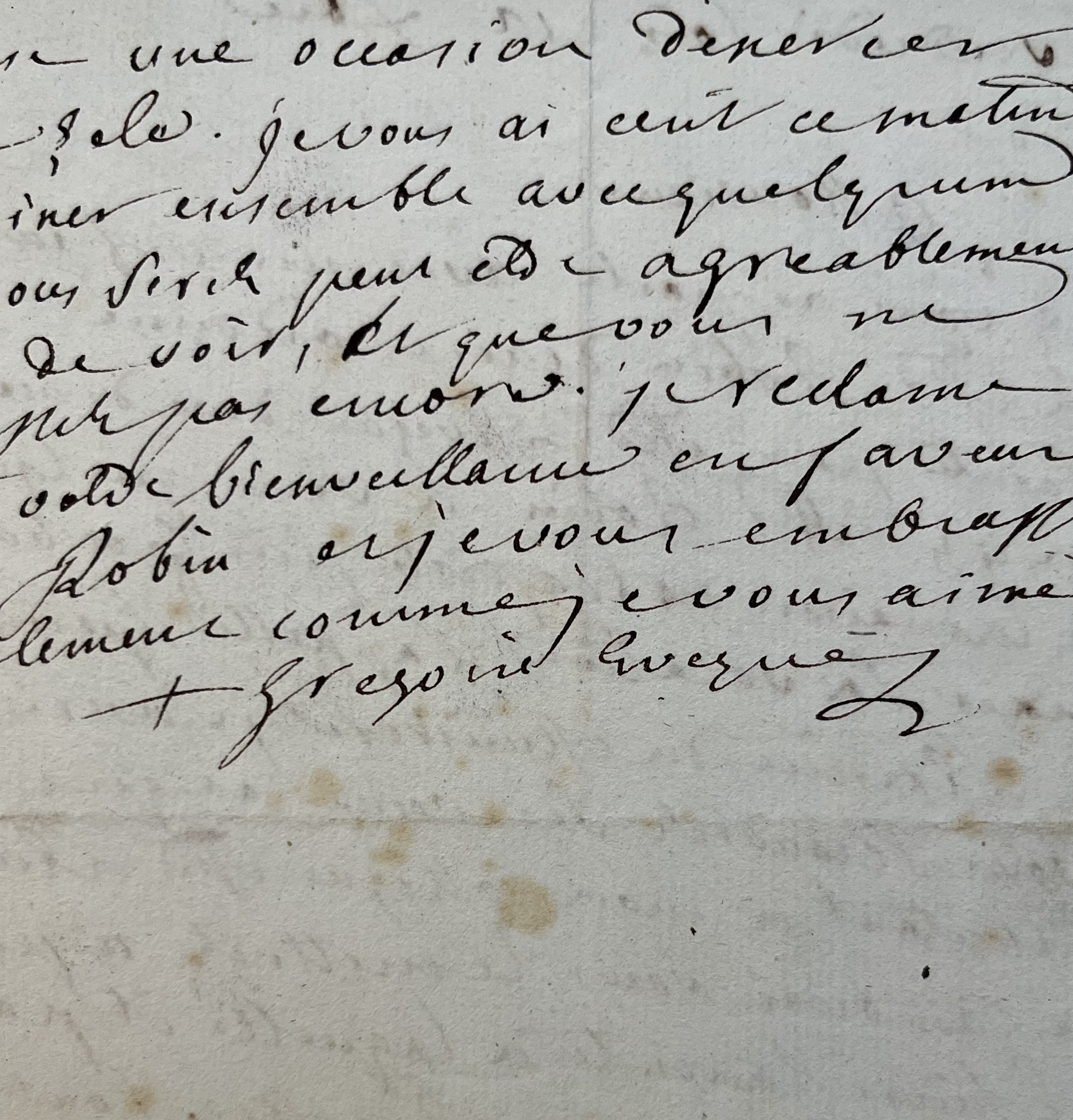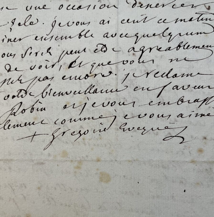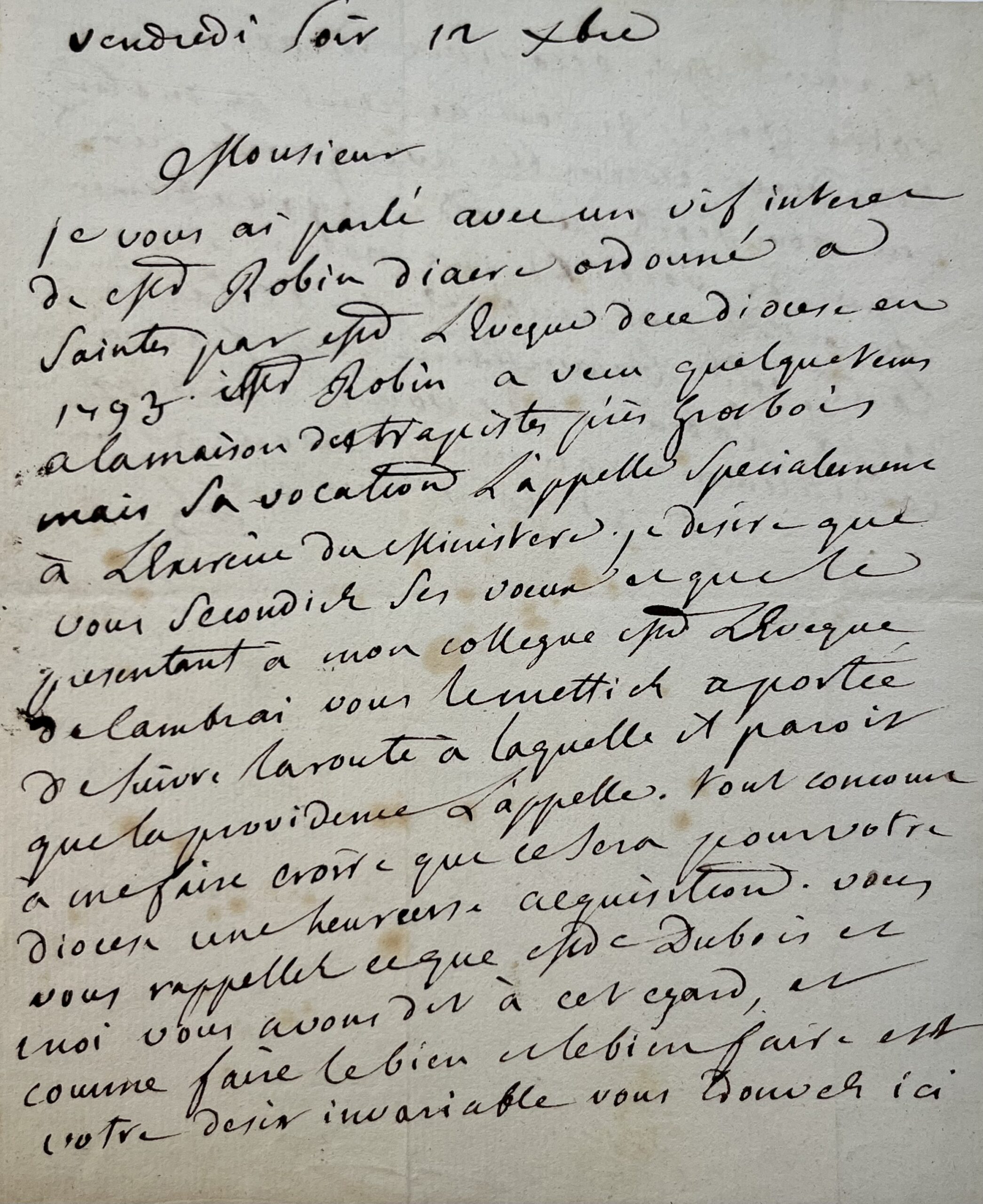 "Je vous ai parlé avec un vif intérêt de Mr Robin diacre ordonné à Saintes par Mr l'Evêque de ce diocèse en 1793. Mr Robin a vécu quelques tems à la maison des trappistes près Grosbois [dans le monastère des Camaldules du château de Grosbois] mais sa vocation l'appelle spécialement à l'exercice du ministère. Je désire que vous secondiez ses voeux et que le présentant à mon collègue Mr l'Evêque de Cambrai vous le mettiez à portée de suivre la route à laquelle il paroit que la providence l'appelle. Tout concourt à me faire croire que ce sera pour votre diocèse une heureuse acquisition [...]". Signée "Grégoire évêque"
