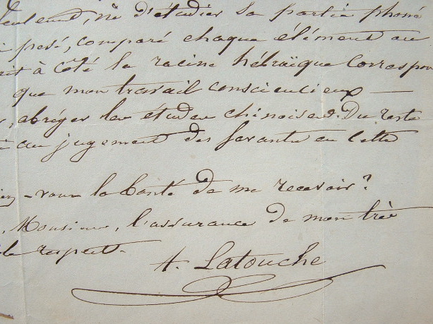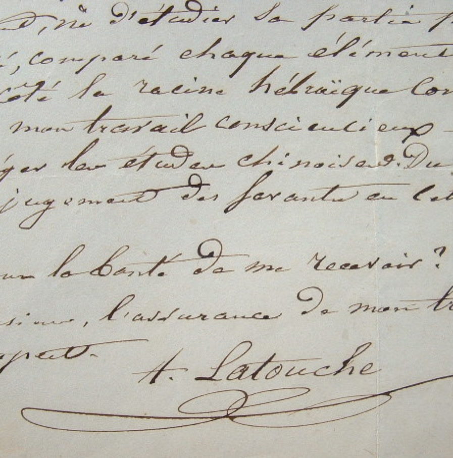 «Cette langue antique que j'ai toute lue, en transcriptions, ce chinois inabordable... Mon âge (68 ans) ne me permet ni d'apprendre même 214 clés seulement, ni d'étudier sa partie phonétique, mais j'ai comparé chaque élément aux racines. J'ai écrit à côté la racine hébraïque correspondante et je crois que mon travail consciencieux pourrait éclairer [...]».