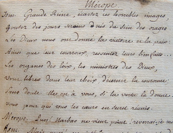 Manuscrit d'éloquence entièrement de la main de l'abbé Millot, précepteur du duc d'Enghien, probablement rédigé pour l'éducation du Dauphin, et intitulé : L'Éloquence des poètes, recueil d'exemples. Extraits de Voltaire (Mérope, Zaïre, Alzire, Rome sauvée, Oreste, Sémiramis), Racine (Andromaque, Britannicus, Bérénice, Bajazet, Mithridate), Corneille (Le Cid, Horace, Polyeucte, Rodogune, Pulchérie), Gresset (Édouard III), Chateaubrun (Philoctète), etc., avec quelques commentaires en marge : «Noble désespoir, Tyrannie, Politique cruelle, Tendresse maternelle», etc.