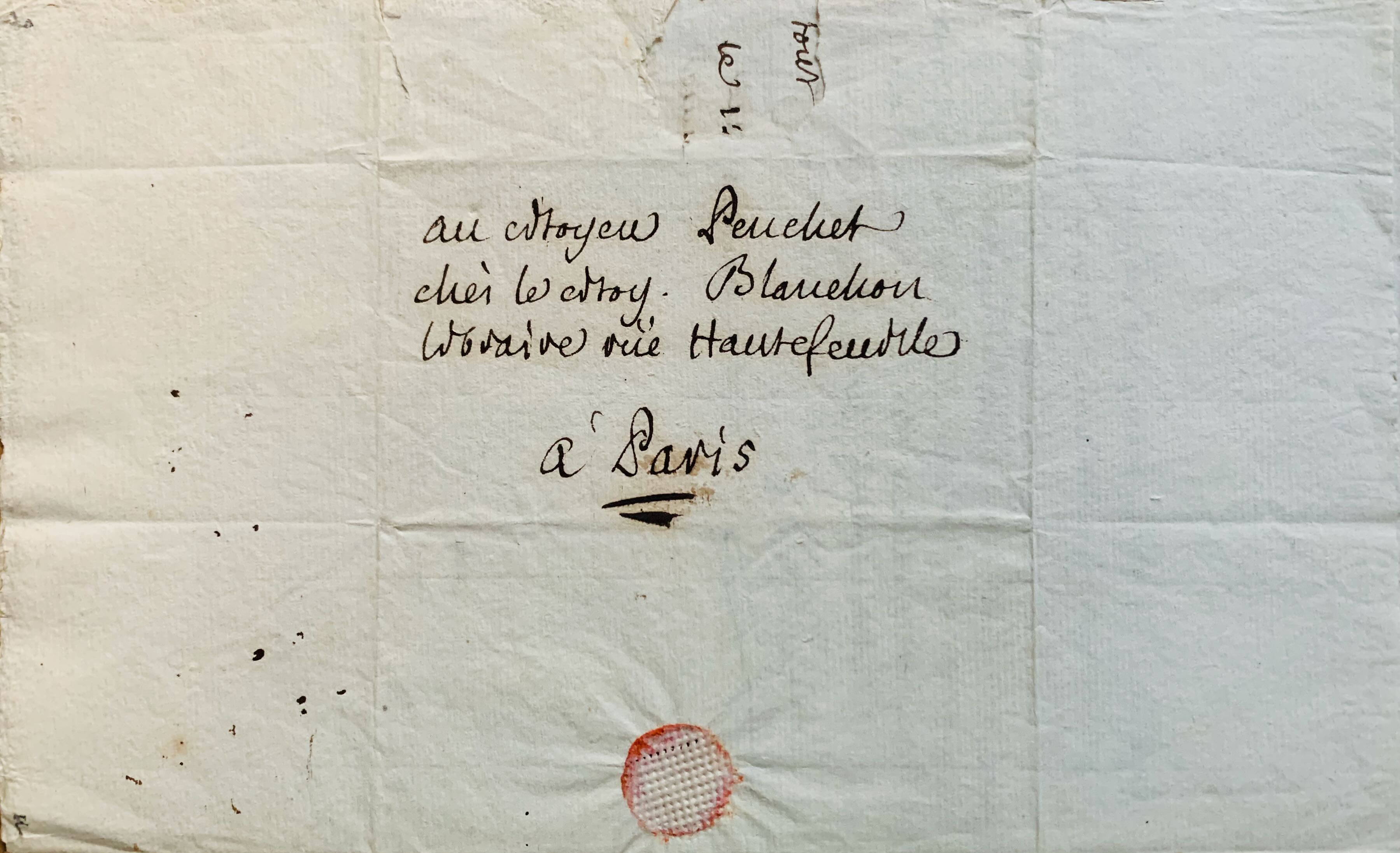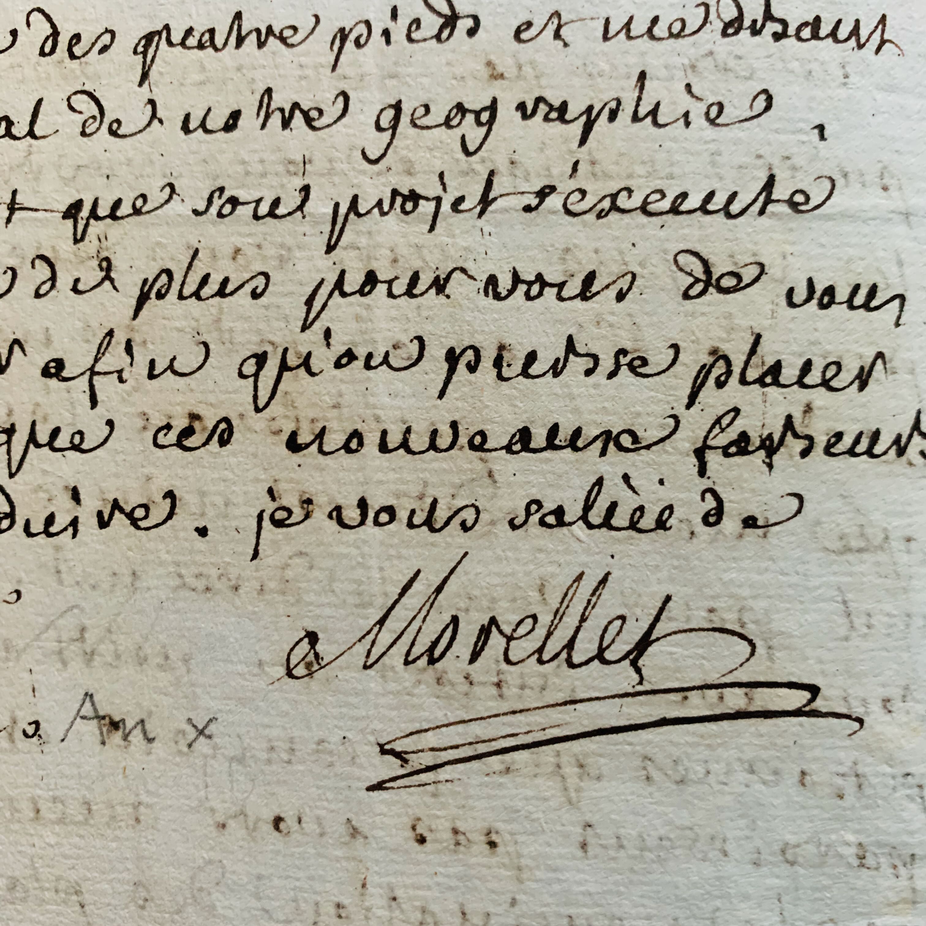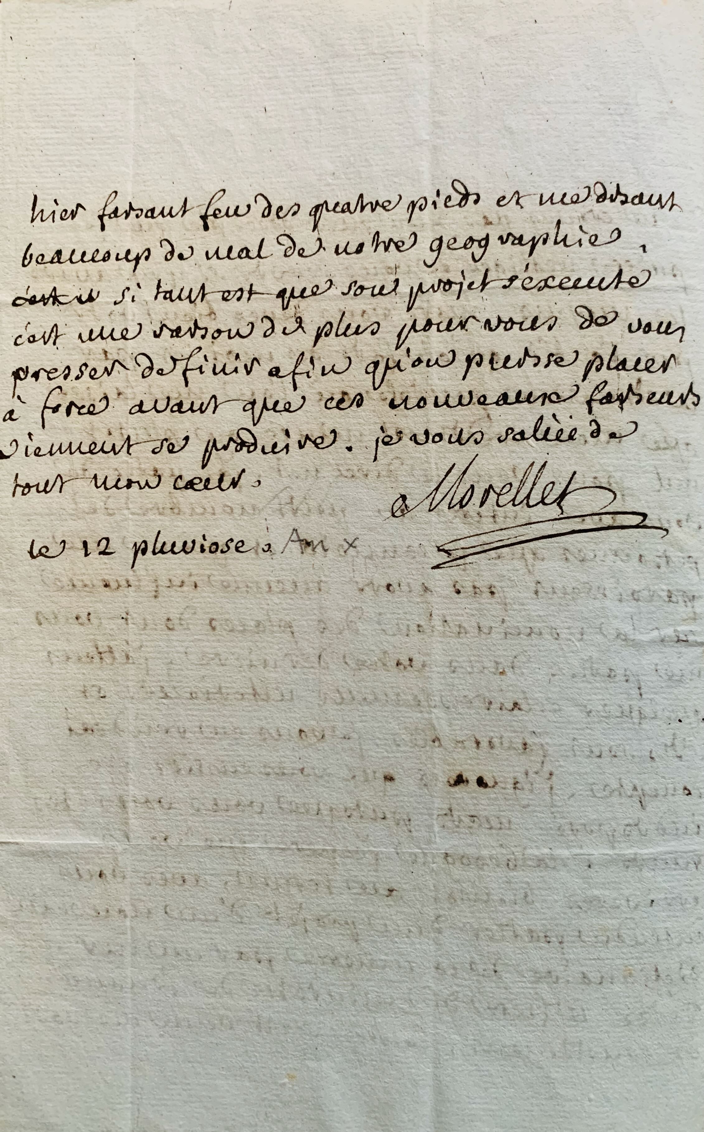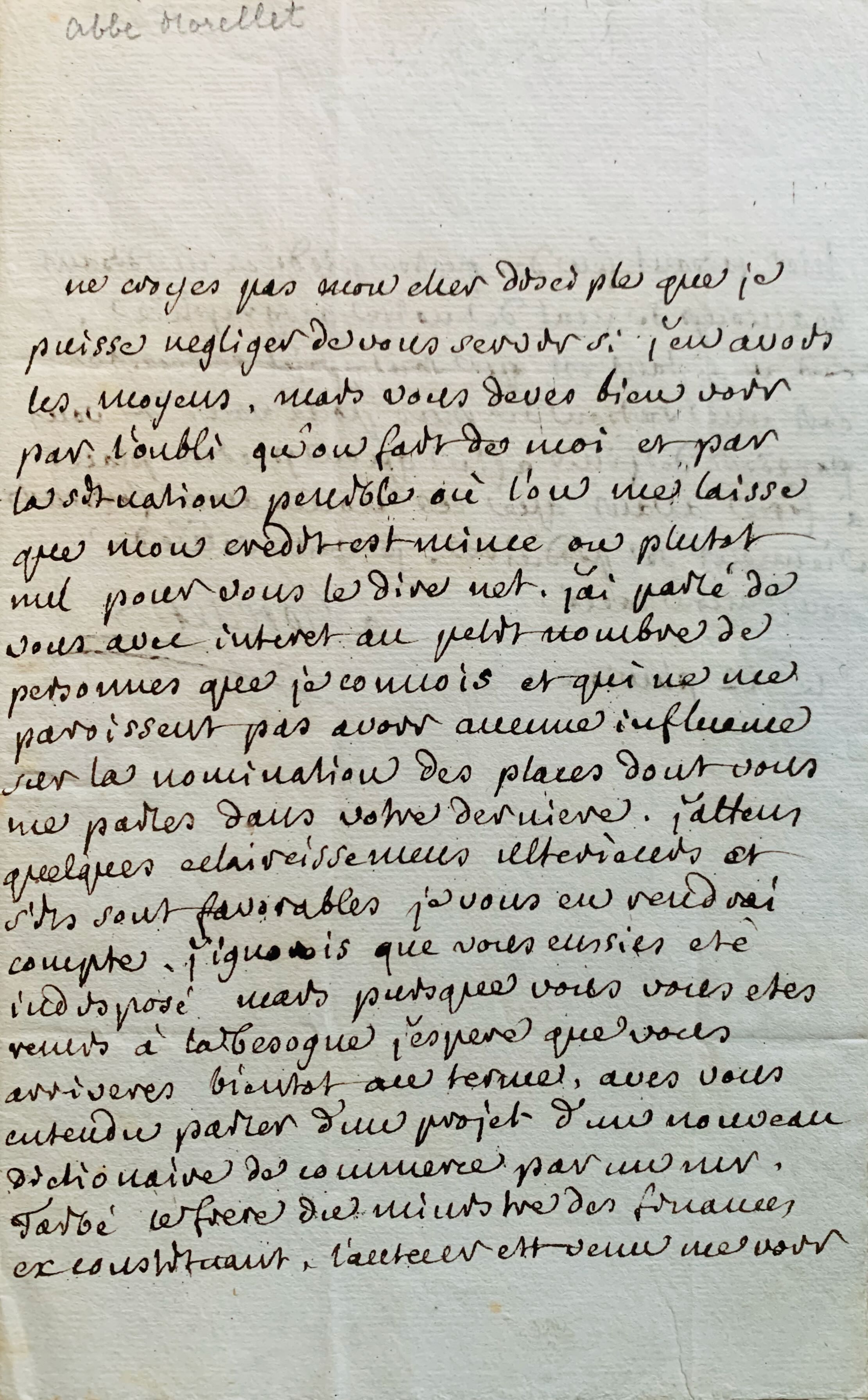 André Morellet (Lyon, 1727/1819)"Ne croyez pas, mon cher disciple, que je puisse négliger de vous servir si j'en avois les moyens. Mais vous devez bien voir par l'oubli qu'on fait de moi et par la situation pénible où l'on me laisse, que mon crédit est mince ou plutôt nul pour vous le dire net. J'ai parlé de vous avec intérêt au petit nombre de personnes que je connois et qui ne me paroissent pas avoir aucune influence sur la nomination des places dont vous me parlez dans votre dernière. J'attends quelques éclaircissements ultérieurs et s'ils sont favorables je vous en rendrai compte [...]. Avez-vous entendu parler d'un projet d'un nouveau Dictionnaire de commerce par un M. Tarbé le frère du ministre des finances ex-constituant. L'auteur est venu me voir hier faisant feu des quatre pieds et me disant beaucoup de mal de votre Géographie [Dictionnaire universel de la géographie commerçante]. Si tant est que son projet s'exécute, c'est une raison de plus pour vous de vous presser de finir afin qu'on puisse placer à force avant que ces nouveaux faiseurs viennent se produire [...]"