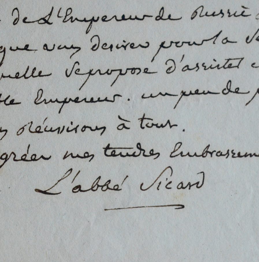 Roch Ambroise Sicard, Cucurron, dit l'abbé (Fousseret, 1742/1822)"À mon bon bon ami, le cher abbé Guillon. Je ne perds pas de vue, mon cher ami et votre lettre à remettre au secrétaire d'Etat de l'Empereur de Russie & les billets que vous désirez pour la séance à laquelle se propose d'assister cet aimable Empereur. Un peu de patience, et nous réussirons à tout. Agréez mes tendres embrassements [...]."