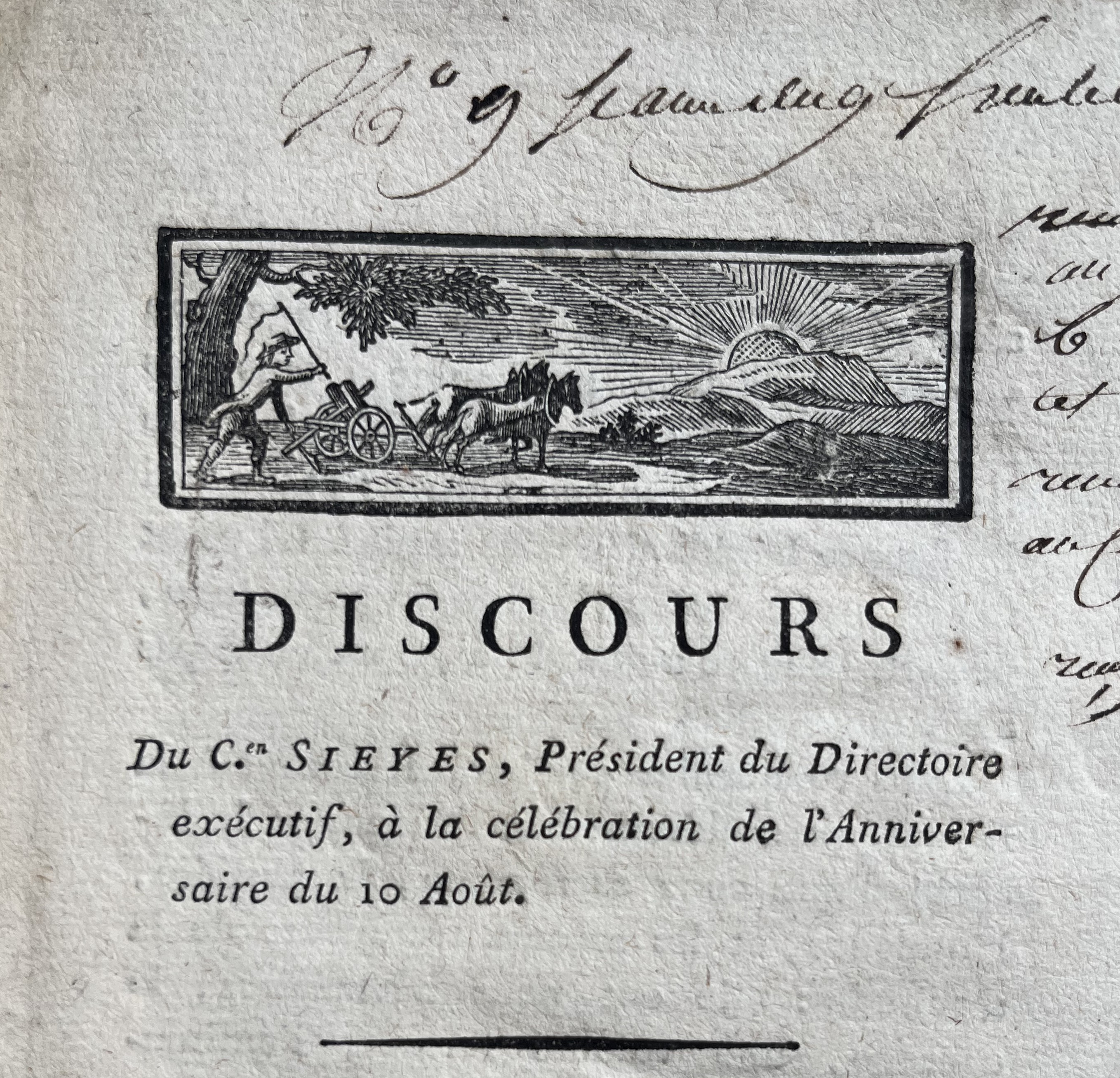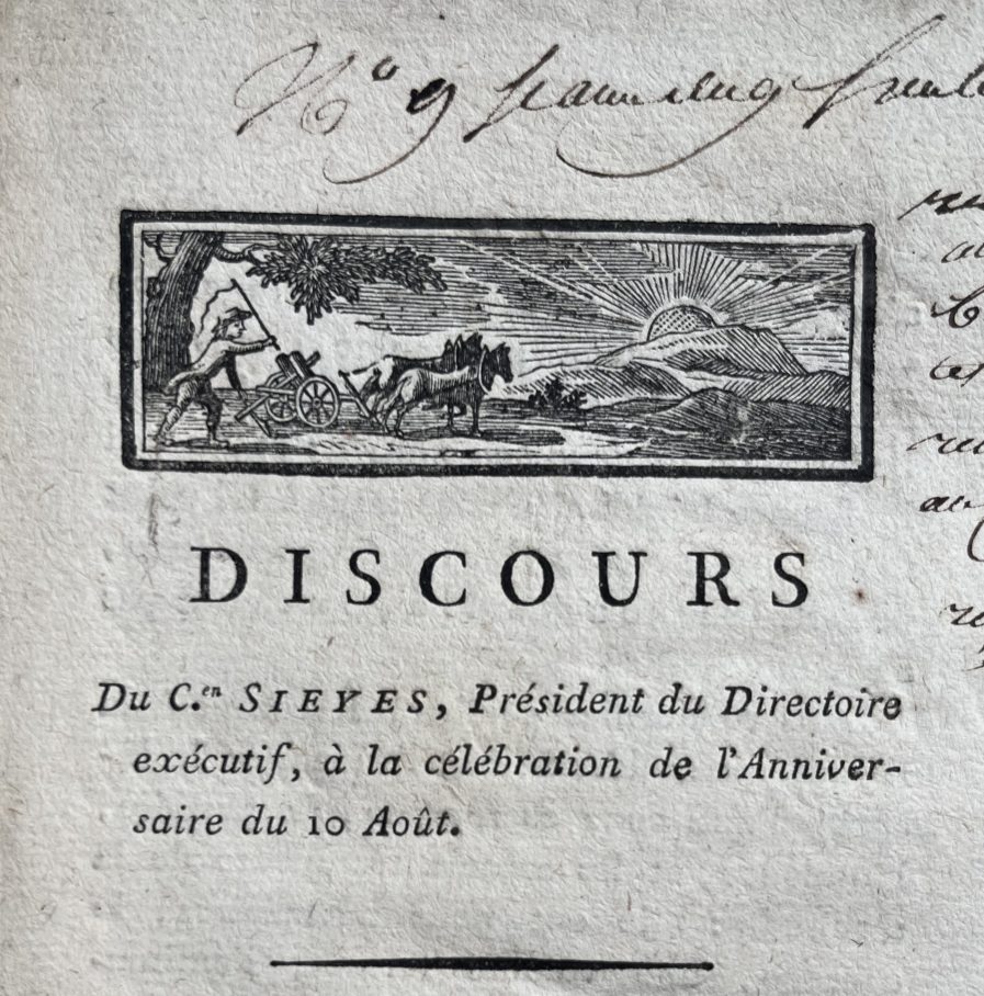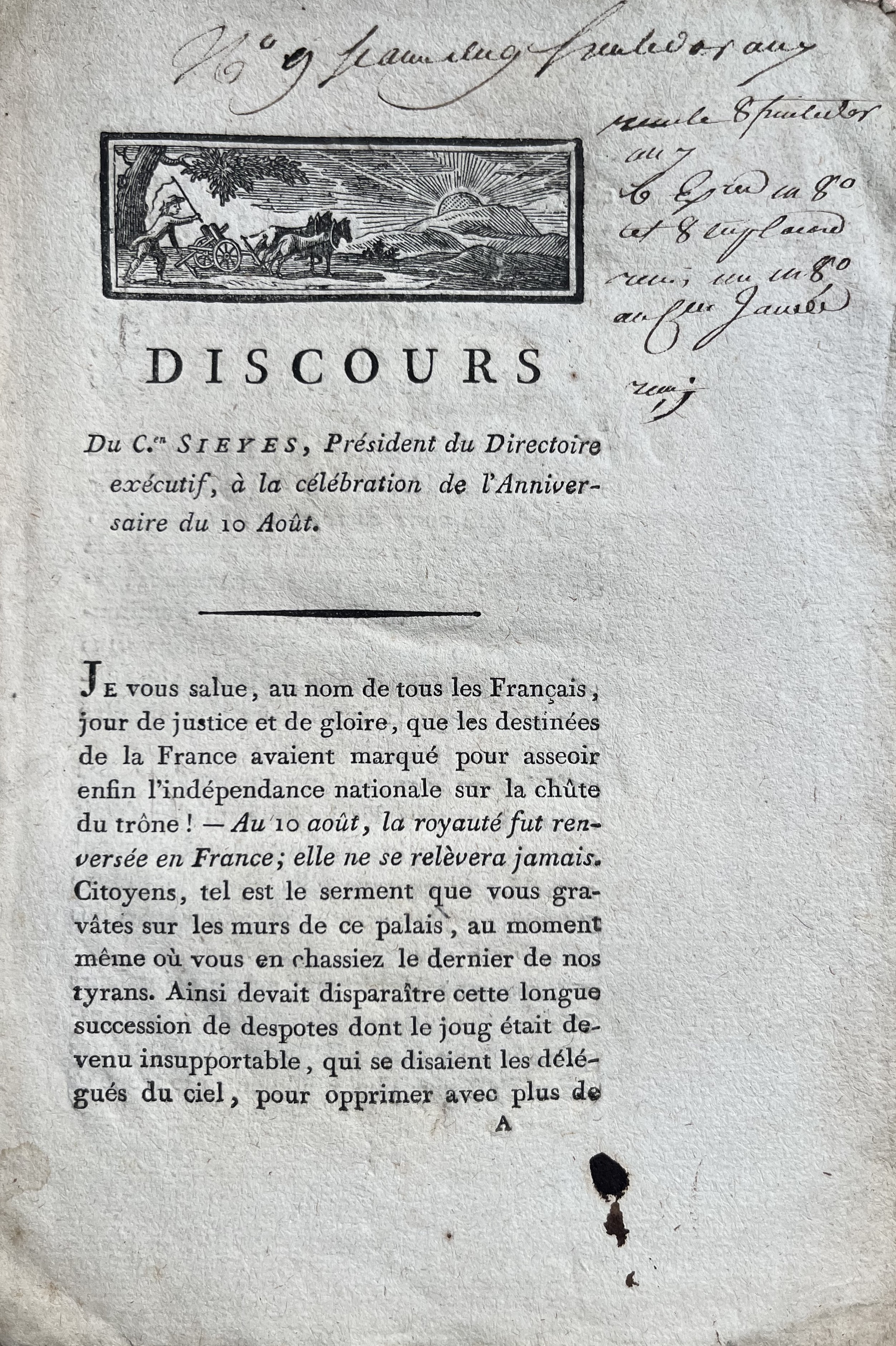 Plaquette imprimée ornée d'un joli bandeau gravé sur bois : "Discours du citoyen Sieyès, président du Directoire exécutif, à la célébration de l'anniversaire du 10 août". Grandes marges.