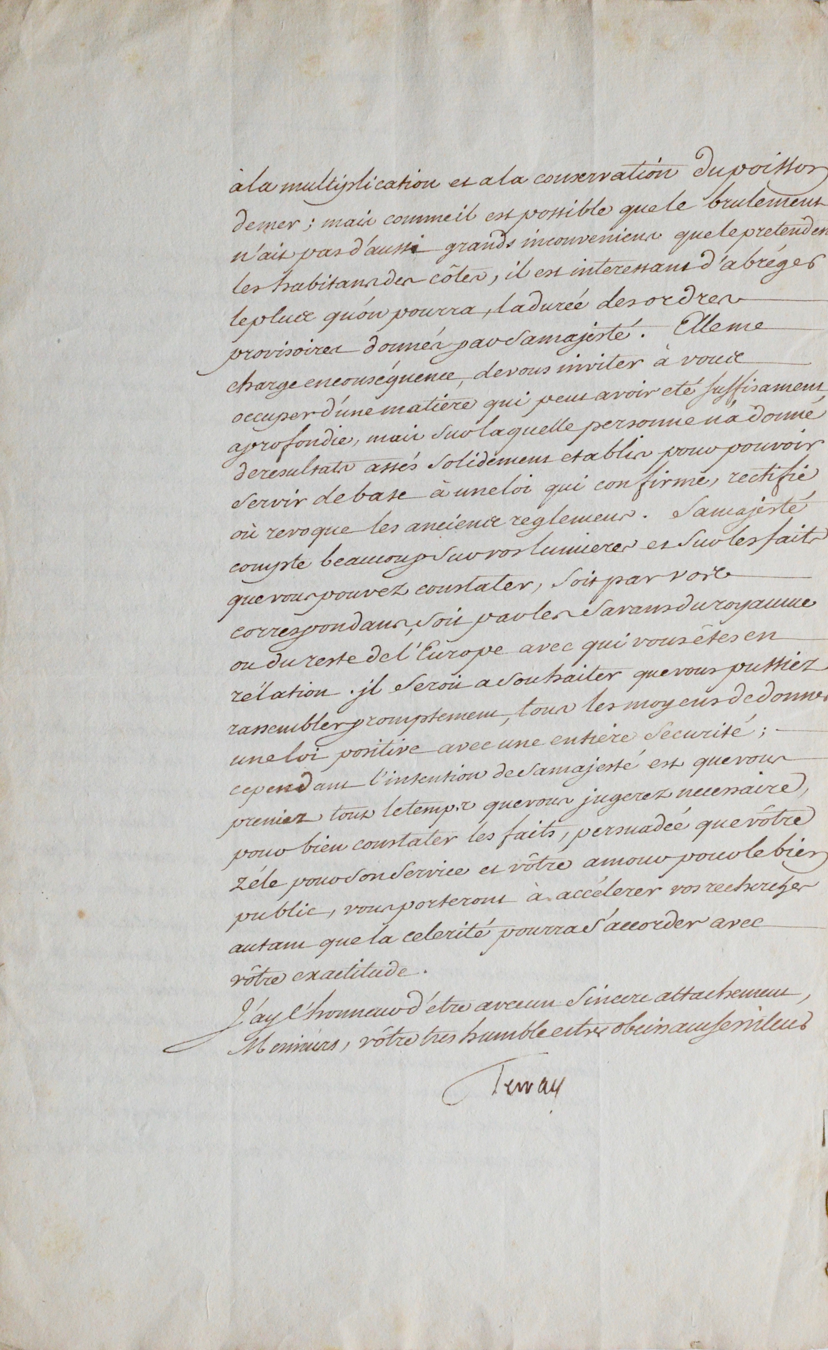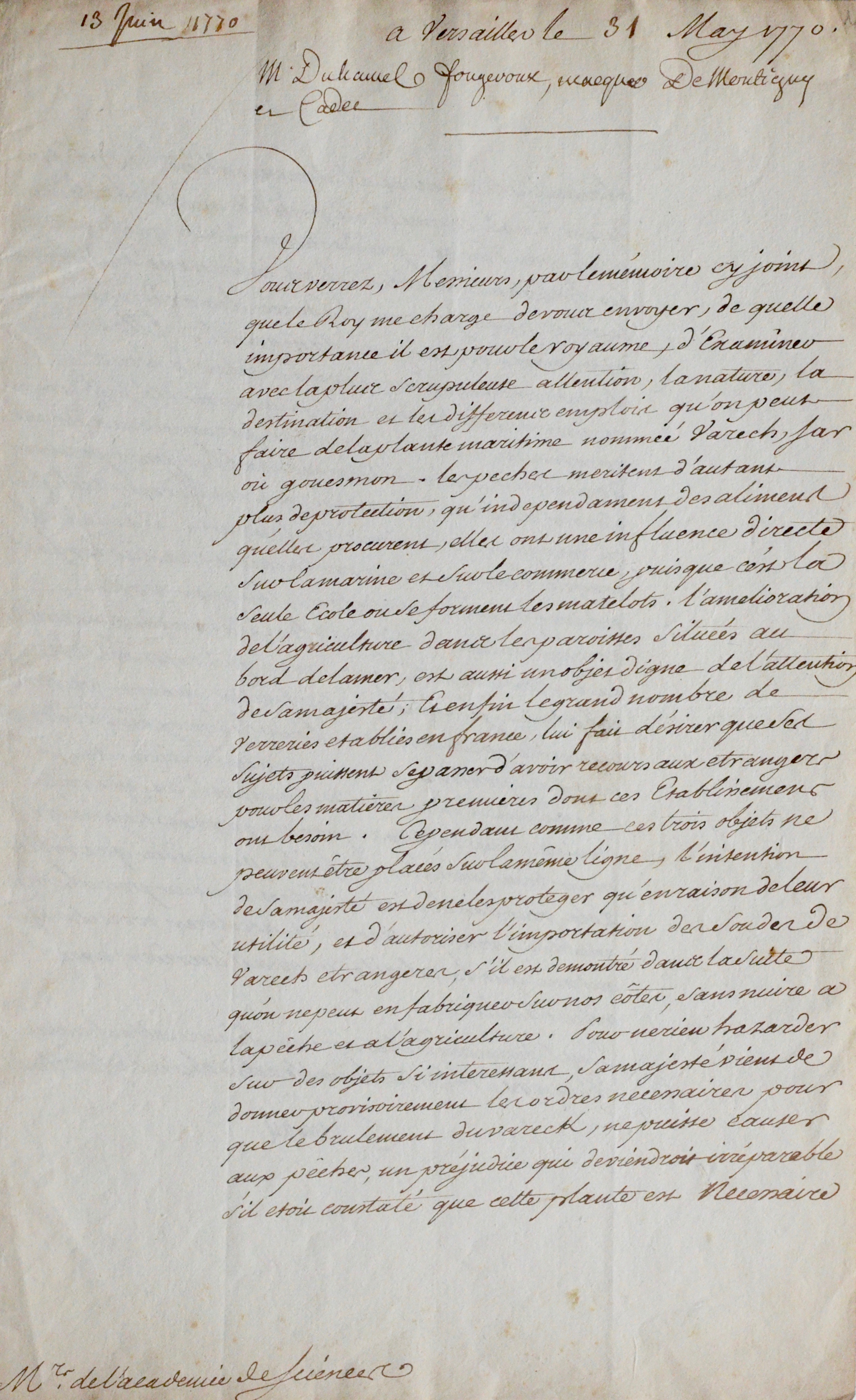 Sur l'exploitation des algues (Varech ou goémon) et la pêche. Il leur adresse un mémoire et demande à ce qu'il soit examiné "avec la plus scrupuleuse attention" afin de connaître leur avis sur l'exploitation maritime "de la plante maritime nommée varech ou gouesmon. Les pêches méritent d'autant plus de protection, qu'indépendamment des aliments qu'elles procurent, elles ont une influence directe sur la marine et sur le commerce […]. Cependant, comme ces trois objets ne peuvent être placés sur la même ligne, l'intention de Sa Majesté est de ne les protéger qu'en raison de leur utilité, et d'autoriser l'importation des soudes de varech étrangères, s'il est démontré dans la suite qu'on ne peut en fabriquer sur nos côtes, sans nuire à la pêche et à l'agriculture. Pour ne rien hasarder sur des objets si intéressants, Sa Majesté vient de donner provisoirement les ordres nécessaires pour que le brûlement du varech, ne puisse causer aux pêches, un préjudice qui devienroit irréparable s'il étoit constaté que cette plante est nécessaire à la multiplication et à la conservation du poisson de mer […] ". En octobre 1772, le roi légifèrera sur l'exploitation du goémon.