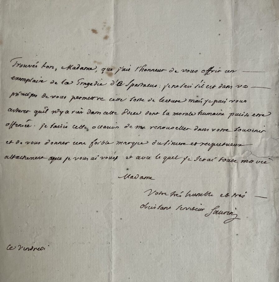 "Trouvés bon, Madame, que j'aie l'honneur de vous offrir un exemplaire de la tragédie de Spartacus : je ne sais s'il est dans vos principes de vous permettre cette sorte de lecture mais je puis vous assurer qu'il n'y a rien dans cette pièce dont la morale humaine pusse être offensée [...]".