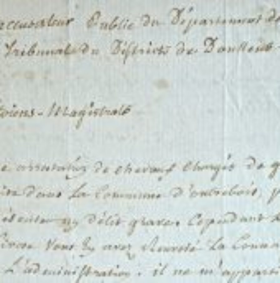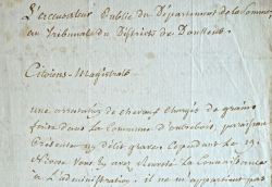 Jean-Baptiste Duval (Oisemont, 1730/1811)Duval, l'accusateur public de la Somme, fait prévaloir son autorité aux juges de Doullens pour une affaire. "Une arrestation de chevaux chargés de grains faite dans la commune d'Outrebois, paraissait présenter un délit grave. Cependant, le 19 nivôse, vous en avez renvoié la connaissance à l'administration. Il ne m'appartient pas d'examiner s'il a été bien ou mal jugé. J'observerai seulement que votre jugement, dont il ne m'a été adressé copie que le 9 de ce mois, est particulièrement fondé sur des renseignements donnés, verbalement sans doute, par les administrateurs au commissaire national. Je suis loin de soupçonner la fidélité du rapport". Cependant, il leur rappelle que tout doit être consigné par écrit. "J'ajoute que le voeu d'un corps délibérant ne peut jamais être connu que par le résultat d'une délibération prise à la pluralité des voix. Je vous prie donc de m'expliquer ce qui a pû occasionner cette violation au moins très apparente de la loi. Je vous prie aussi de vouloir bien me faire passer un extrait des différentes pièces qui ont pu motiver votre décision, et que j'ai jusqu'ici réclamées sans succès".
