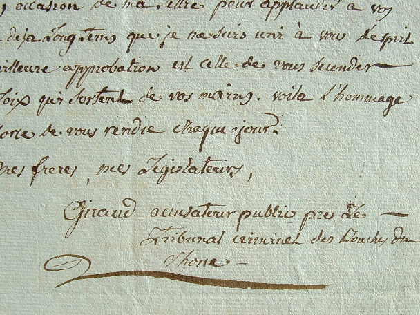 Joseph Giraud (Toulon, 1758/1842)Joseph Giraud, l'accusateur public du tribunal criminel des Bouches-du-Rhône, envoie au Comité de Salut public un négociant, Louis Chevéry «ayant mission des représentants du peuple, envoyé à Commune Affranchie [Lyon] pour l'achat de grains chez l'étranger», qui a réglé ses achats en faux assignats. Il demande que soit menée une enquête sur la manière dont «cet agent de la République a pu recueillir une somme aussi conséquente» [16.000 livres]. Dans cette affaire, il a mis en arrestation également son beau-frère. Une partie de la fausse monnaie a déjà été écoulée ; il va mener une enquête. «Je pense que si les agents de la République, dans le genre de pourvoyeurs en grains ou autres marchandises, ne sont pas très circonspects ou mieux bon connoisseurs de la monnoie nationale dont se servent les étrangers avec eux, il arrivera qu'involontairement ils deviendront eux-mêmes les introducteurs des faux assignats». En officier ministériel zélé, il ajoute : «je ne prendrai pas occasion de ma lettre pour applaudir à vos travaux. Il y a déjà longtemps que je me suis uni à vous d'esprit et d'âme. La meilleure approbation est celle de vous seconder et d'exécuter les lois qui sortent de vos mains. Voilà l'hommage que je m'efforce de vous rendre chaque jour. Adieu mes frères, mes législateurs».