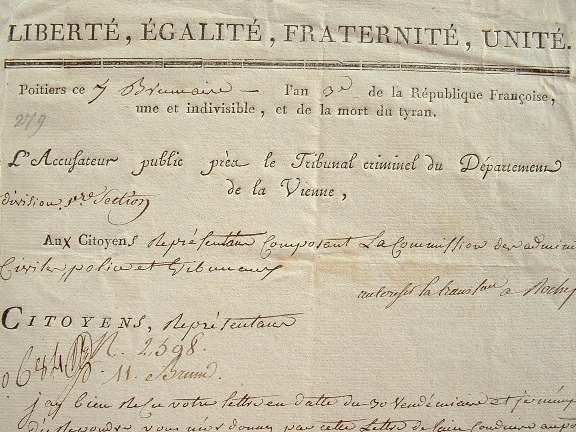Lettre de l'accusateur public près le tribunal criminel du département de la Vienne, Motet. Il s'oppose à la demande de faire conduire au port de Brest les condamnés aux fers qui sont dans la maison de justice de Poitiers, et en explique les raisons. «Les brigands qui infestent la Vendée occupent de temps à autre les différentes routes que je pourrois faire tenir à ces condamnés pour joindre la ville de Nantes, et en supposant même qu'ils parviennent jusque là sans accident, il seroit à craindre qu'ils fussent délivrés soit vers Redon soit aux environ d'Elven où il faudroit qu'ils passassent nécessairement, quelque chemin qu'ils prissent, ces pays étant peuplés de bois, landes et bruyères. Je sens bien qu'en me prescrivant de les envoyer au port de Brest, il faut qu'ils y soient plus nécessaires que dans d'autres ports, mais s'il y a un danger évident, ces individus étant, surtout la majeure partie, de grands scélérats, ne conviendroit-il pas mieux de les faire passer au port de Rochefort où leur conduite peut s'opérer sans aucun risque [...]».