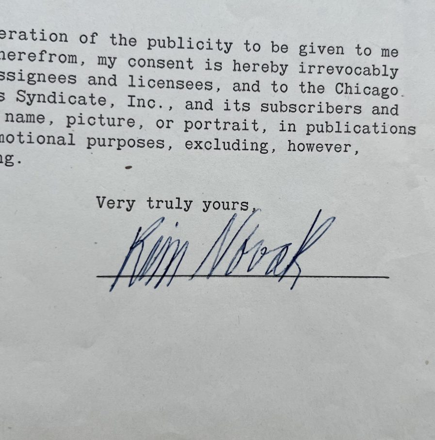Kim Novak donne son consentement au Chicago Tribune-New York News Syndicats, Inc. et à ses abonnés pour toute publicité à des fins éditoriales, autre que la publicité commerciale. "In consideration of the publicity to be given to me and which may arise herefrom, my consent is hereby irrevocably given to you, your assignees and licensees, and to the Chicago Tribune-New York News Syndicats, Inc., and its subscribers and for editorial or promotional purposes, excluding, however, commercial advertising[...]". En anglais.