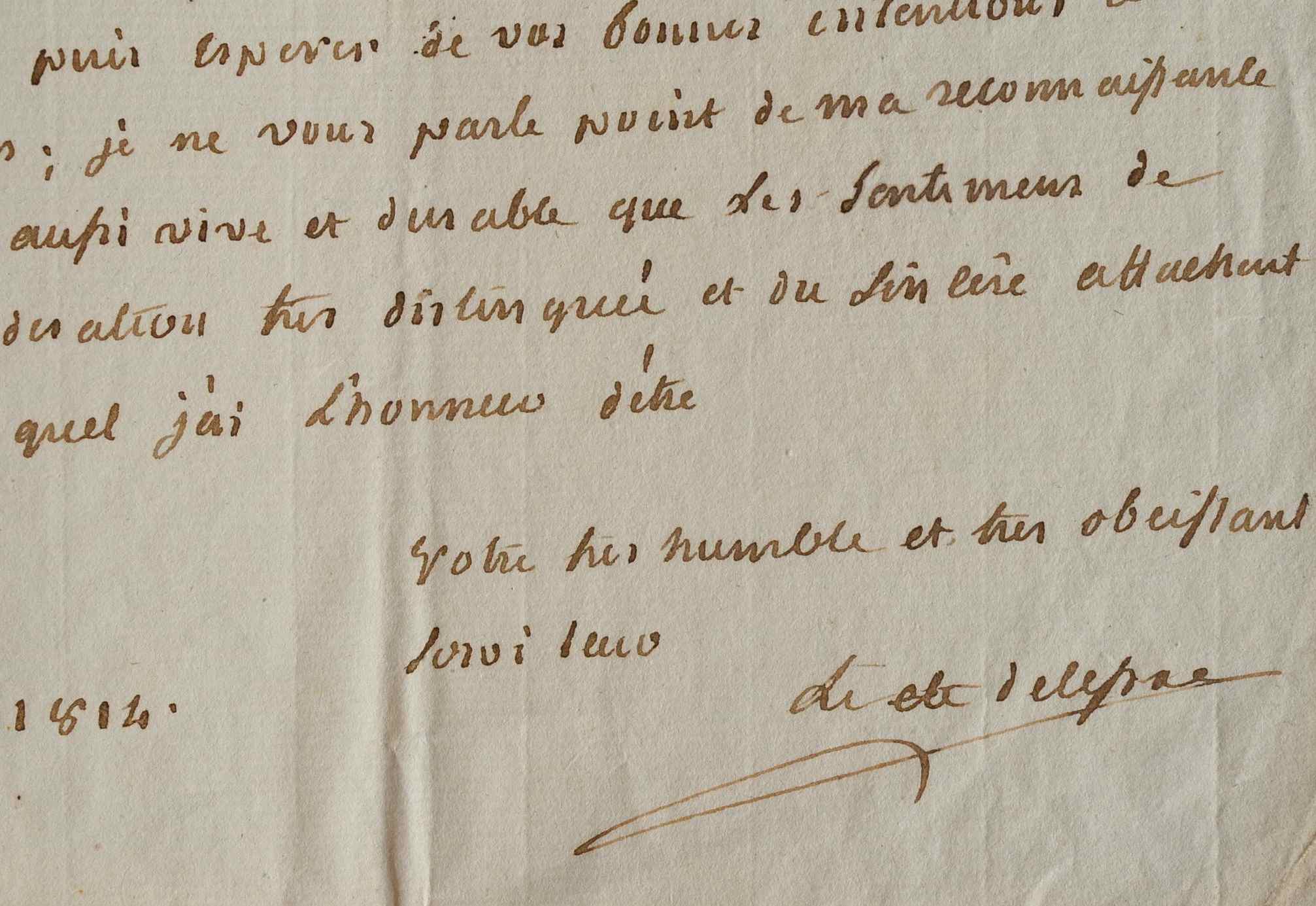 Dans cette lettre très argumentée, l'ancien ministre de la Guerre de Napoléon Jean-Girard Lacuée de Cessac craint pour ses actions dans les canaux du Midi, du Loing et d'Orléans : «Votre lettre m'inspira une très grande sécurité ; je viens de la perdre par l'avis que vient de me donner un officier général de mes amis que la commission a changé de détermination. Il me mande qu'elle veut bien dans son rapport reconnaître la justice des réclamations des donataires, mais qu'elle ne veut point proposer d'amendement à l'article 10 par lequel ne pouvait se vérifier quelles actions devaient être données aux donataires, ni sur quel canal elles devaient être prises.» Et il ajoute : «Ainsi, je suppose que le gouvernement ait dans ses mains actuellement 1800 actions, qu'il en faille 120 aux donataires ; que les 1800 actions soient 1200 sur le canal du Midi et 600 sur le canal du Loing et d'Orléans, une simple règle de trois ferait connaitre qu'il faut prélever 80 actions sur les 1200 et 40 sur les 600.» Lacuée de Cessac compte sur le général pour régler cette affaire ; il répugne à l'idée de lancer une pétition.